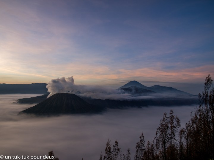 Nous arrivons sains et saufs au sommet du Gunung Penanjakan (2 770 m) et nous nous installons pour voir le lever du soleil à gauche du Gunung Bromo (2 392 m) et du Gunung Semuru qui fume à droite. Nous sommes au-dessus des nuages. Wow! Grandiose! C’est saisissant de voir le volcan apparaître au fur et à mesure que le soleil se lève.