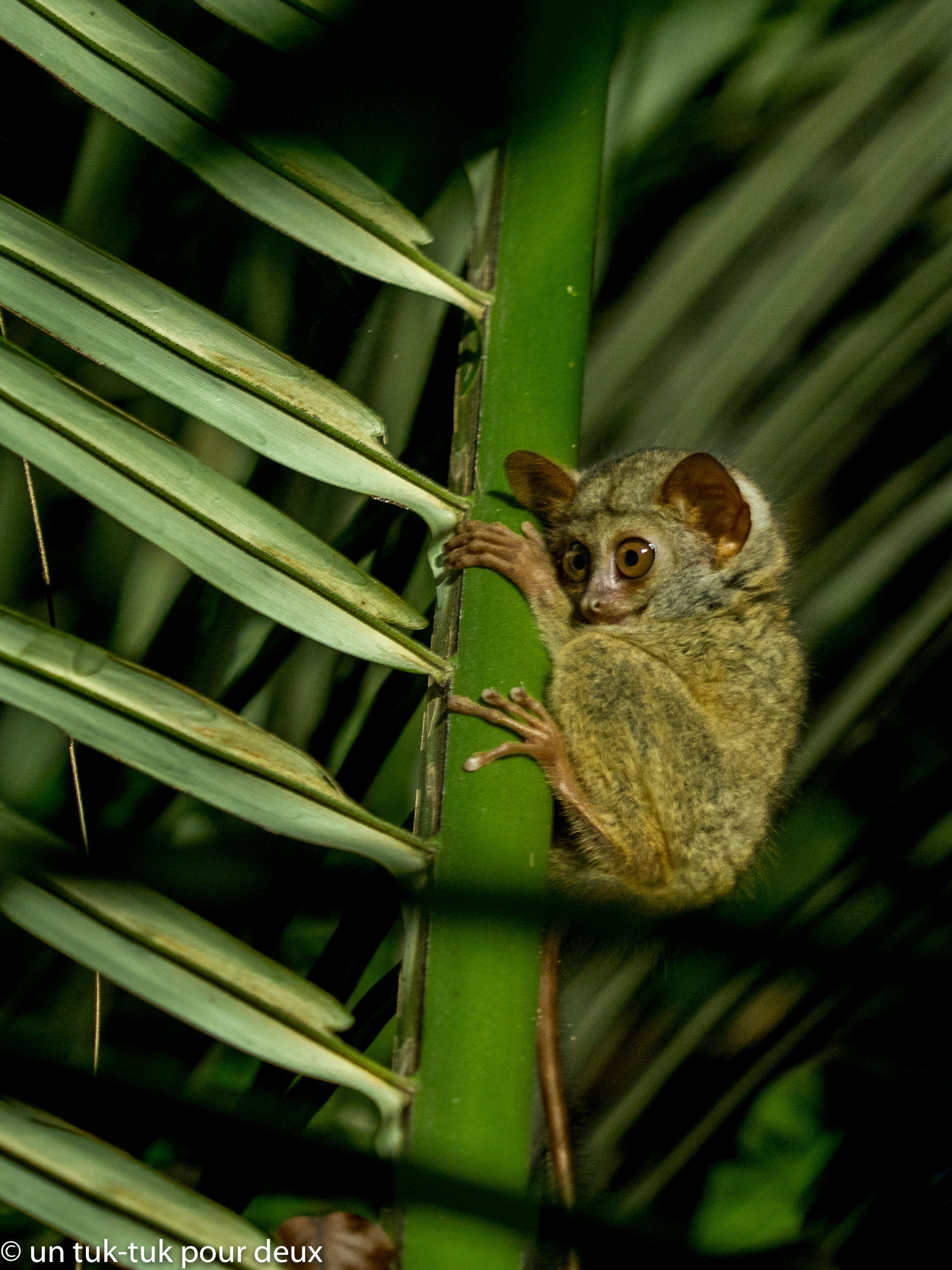 Nous sommes retournés en fin de journée et après environ une heure de marche dans la forêt à la lampe frontale, nous sommes arrivés face à un immense arbre qui abrite toute une famille de tarsiers. Et comme notre guide connaissait très bien leur comportement, elle savait exactement dans quelle direction ils allaient sauter permettant ainsi à Dominique de se placer au bon endroit pour le capter.