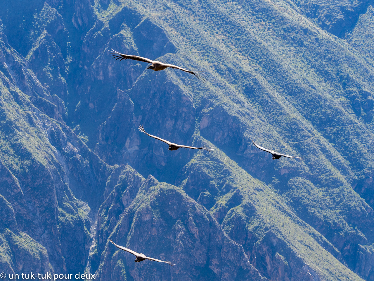 Notre rencontre avec ce géant des airs fut un de nos coups de coeur en Amérique du Sud. Nous en avons aperçu à quelques reprises au cours de notre voyage de plus de trois mois, mais c’est au Mirador Cruz del Condor dans le cañon del Colca au Pérou qu’il faut se rendre pour mesurer la force, l’ampleur et la majesté de ces magnifiques oiseaux.