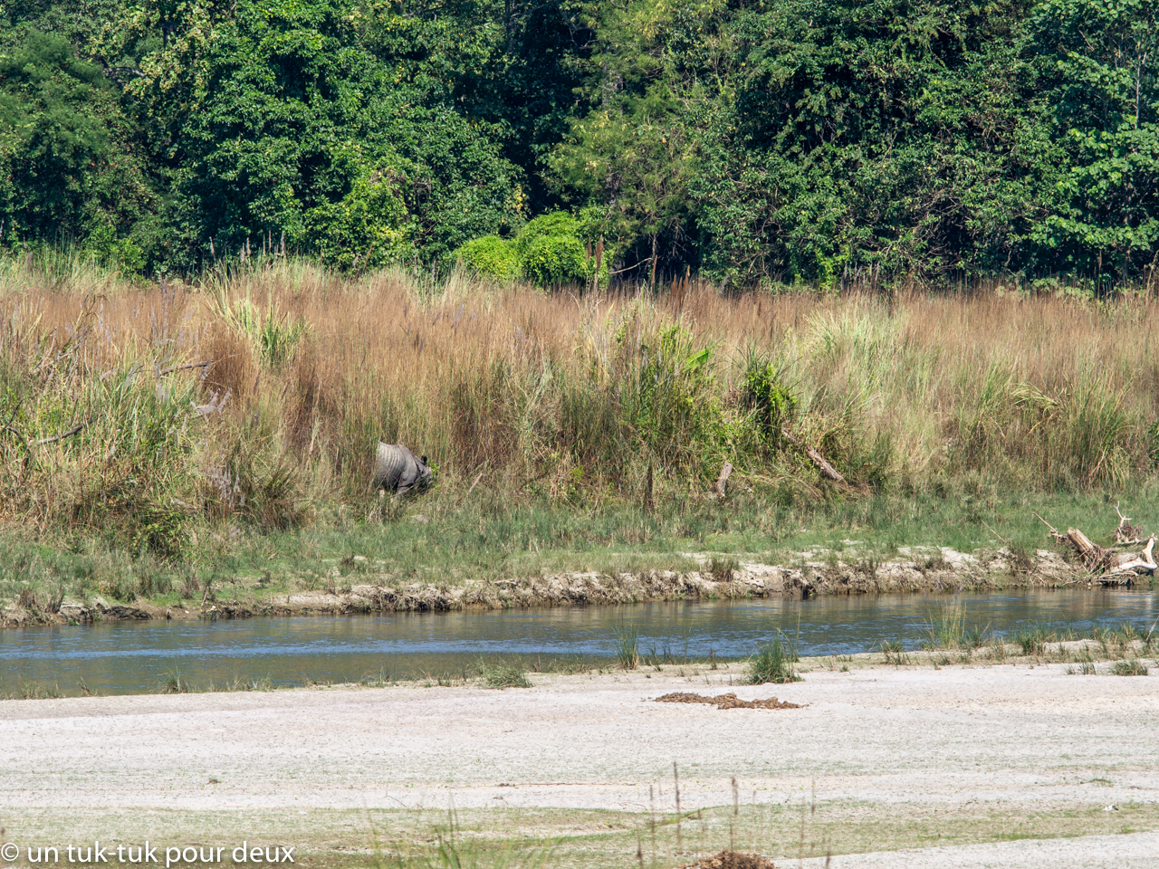 Et chanceux, on peut dire que nous l’avons quand même été. Oui, nous avons pu les voir ces rhinocéros même si c’était d’assez loin. Le guide misait beaucoup sur le bord de la rivière et c’est pour cela qu’il a choisi l’endroit du pique-nique. Bingo, le timing était parfait. Deux rhinocéros sont venus dans la rivière de l’autre côté de la rive.