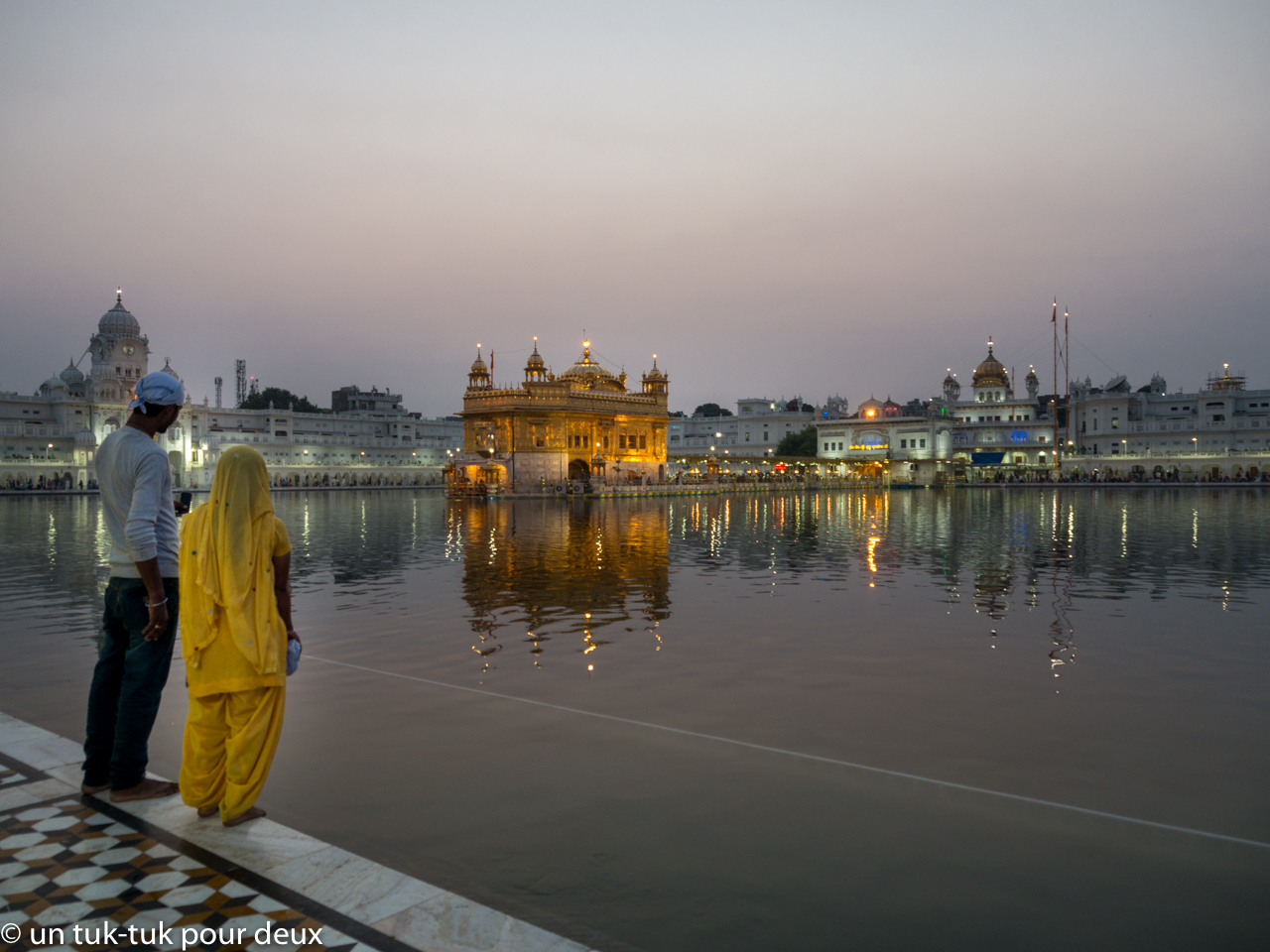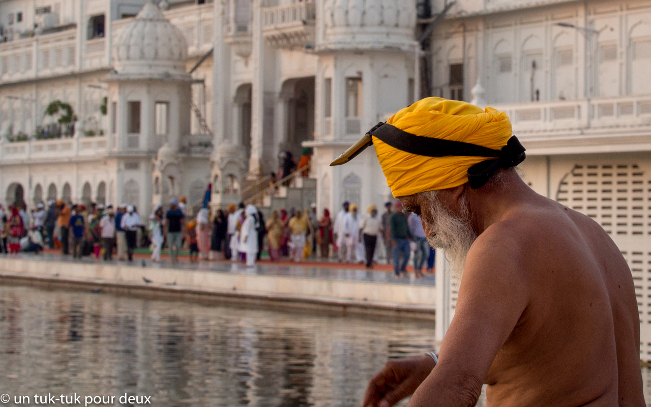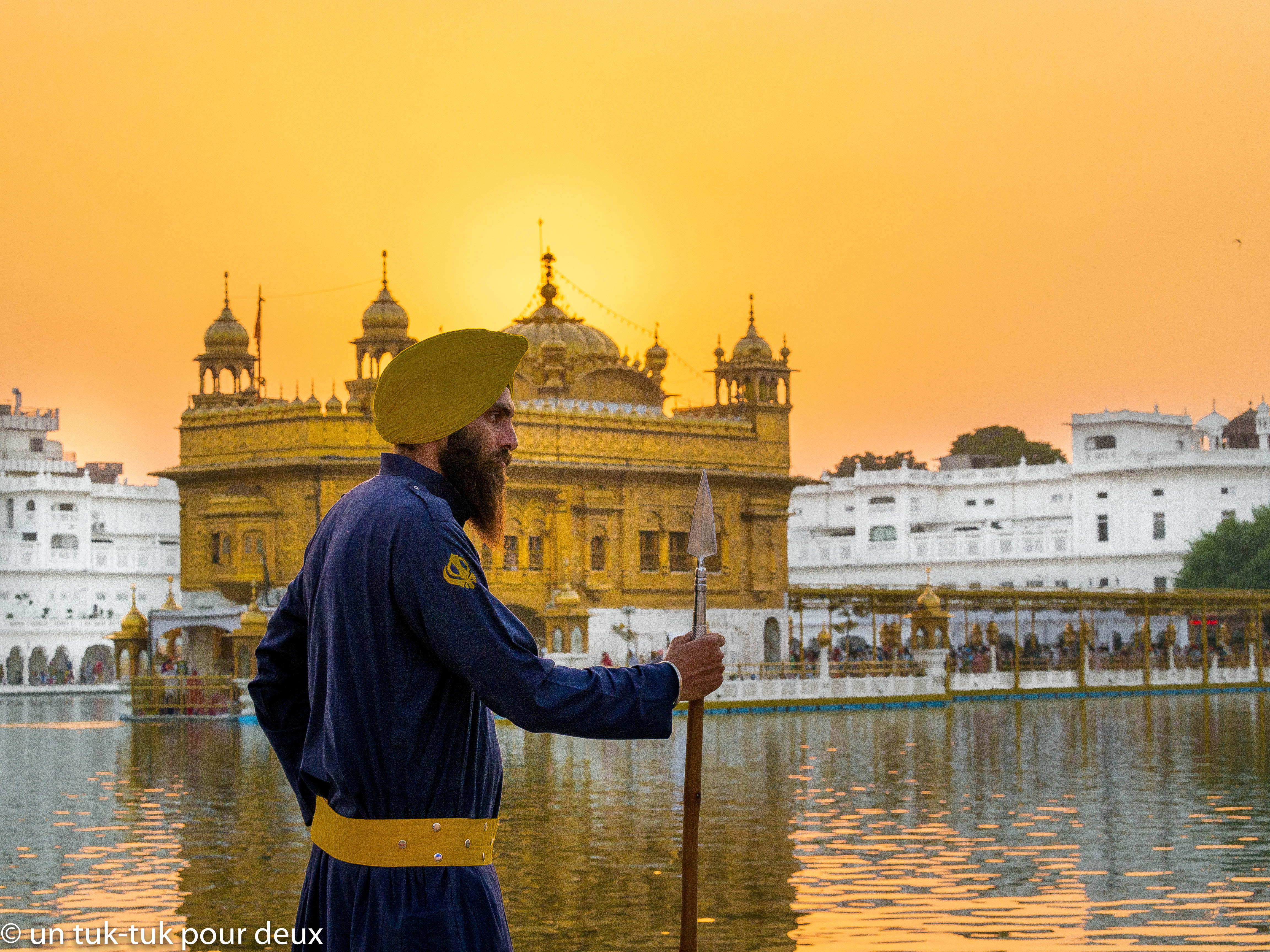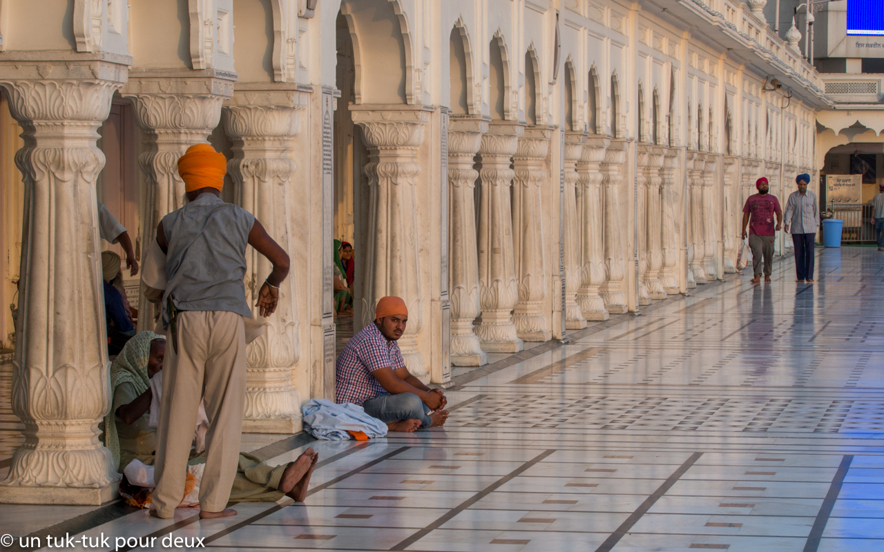 Le temple est au milieu d’un lac artificiel et est entouré d’un vaste complexe qui contient plusieurs salles de cultes et une immense cafétéria où sont servis plus de 50 000 repas gratuits par jour. C’est par la promenade de marbre blanc qu’on accède au pont qui conduit au Temple d’Or qui contient le fameux Livre sacré du sikhisme.
