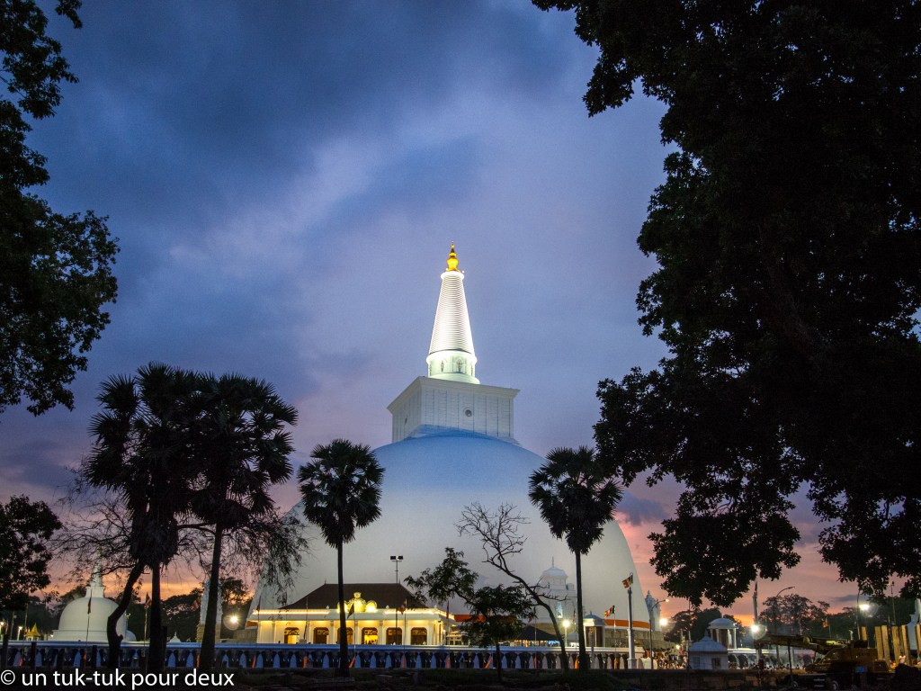 Après la cérémonie de la puja sous l’arbre de Bodhi, nous nous sommes rendus au dagoba de Ruvanvelisaya qui est à quelques minutes de marches. Il est le plus imposant stupa de la ville, haut de 55 mètres et construit 140 ans av. J.-C. Il est vraiment magnifique avec les dernières lueurs du coucher du soleil.