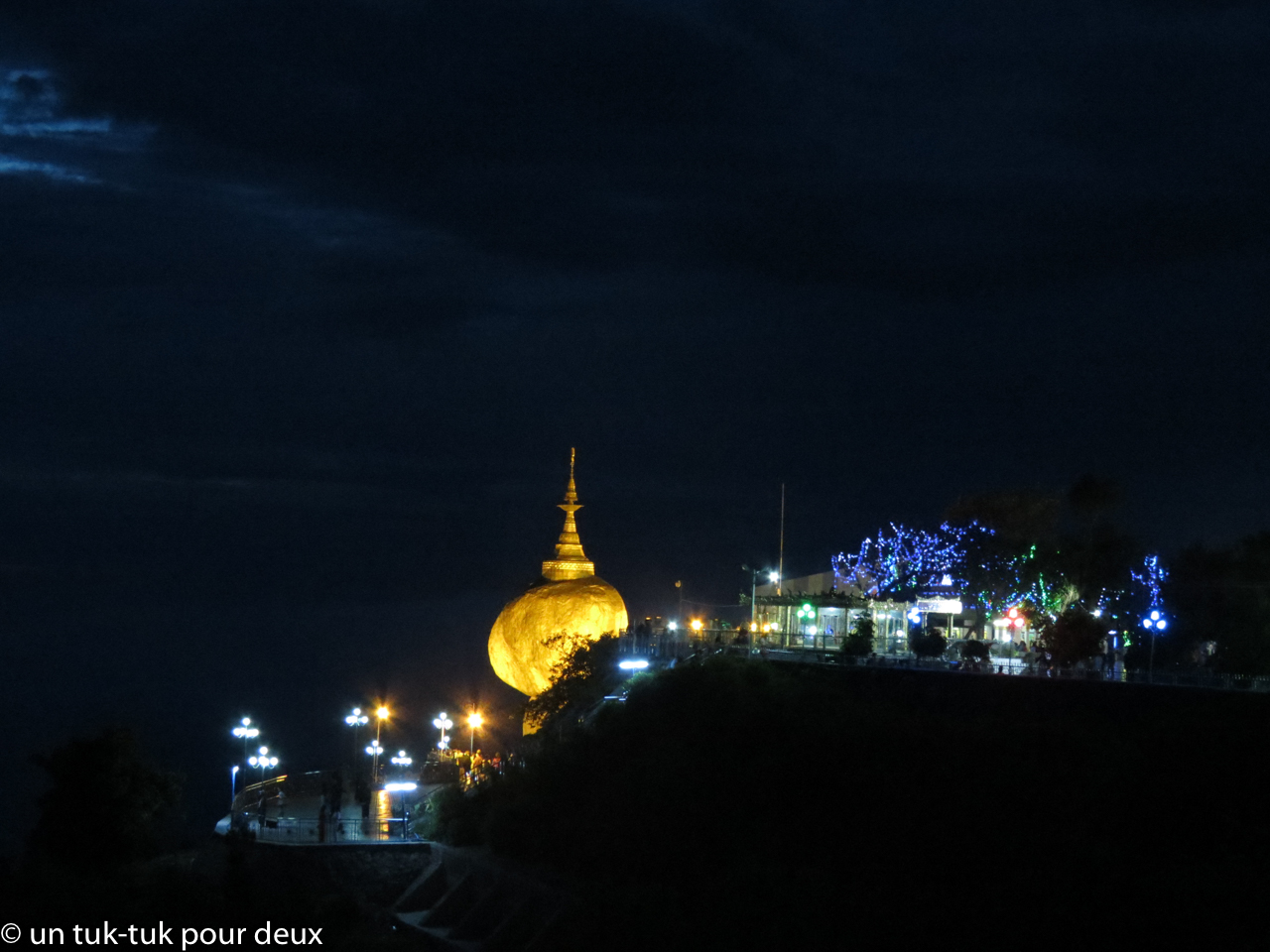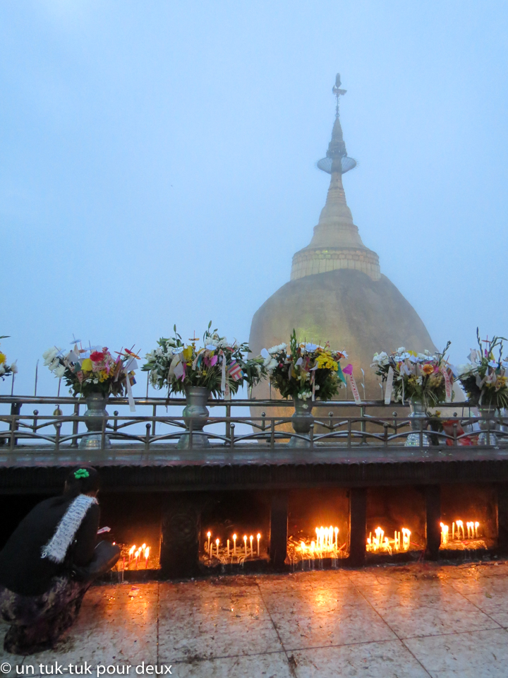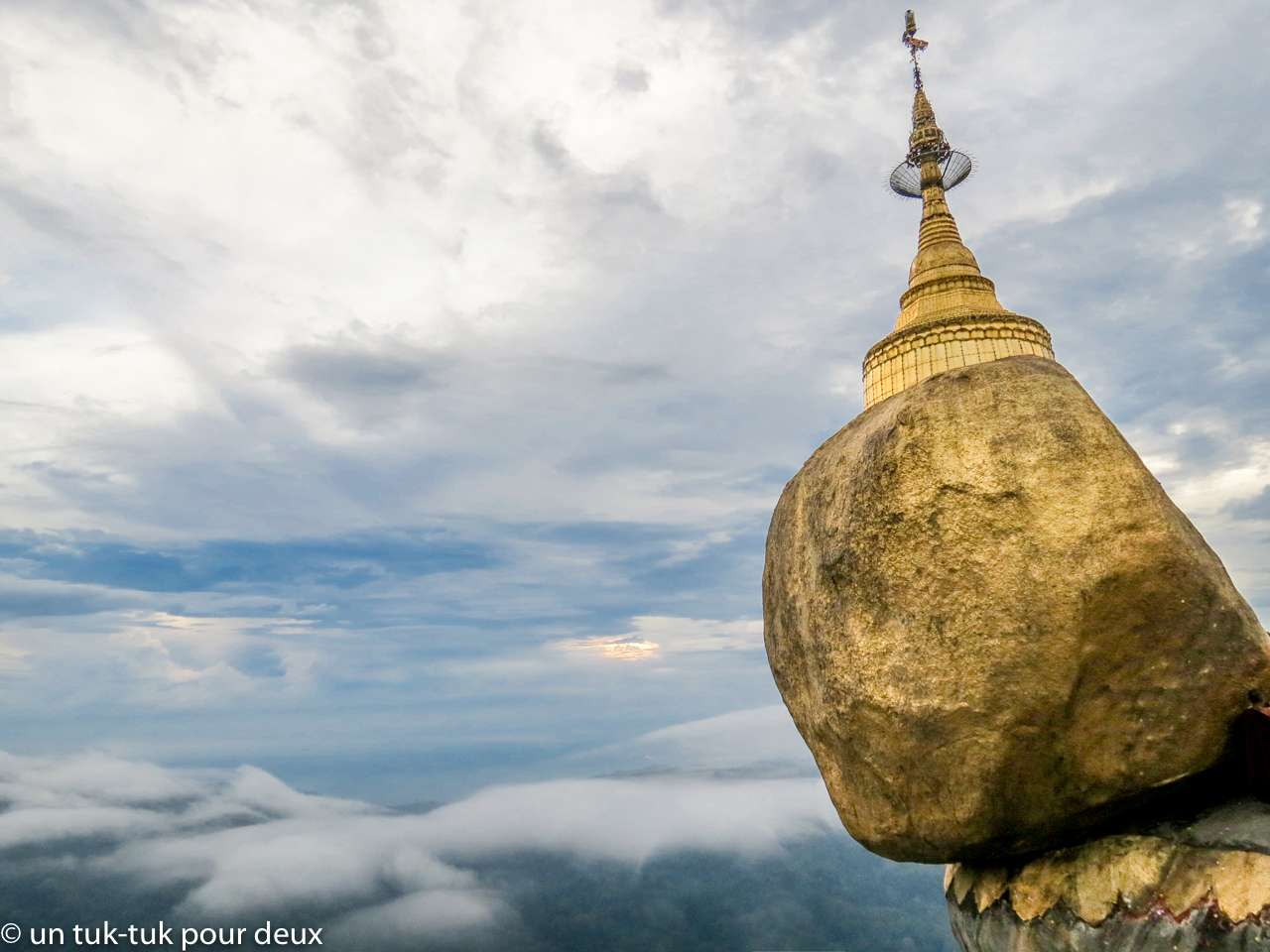 Le Rocher d’Or est l’un des principaux lieux de cultes du bouddhisme du Myanmar, situé au sommet du Mont Ktaikhtiyo à 1 200 m d’altitude. Puisque s’y rendre constitue presque un exploit, le touriste y est encore plus rare qu’ailleurs au pays. Du moins, c’était le cas lors de notre passage en 2012.