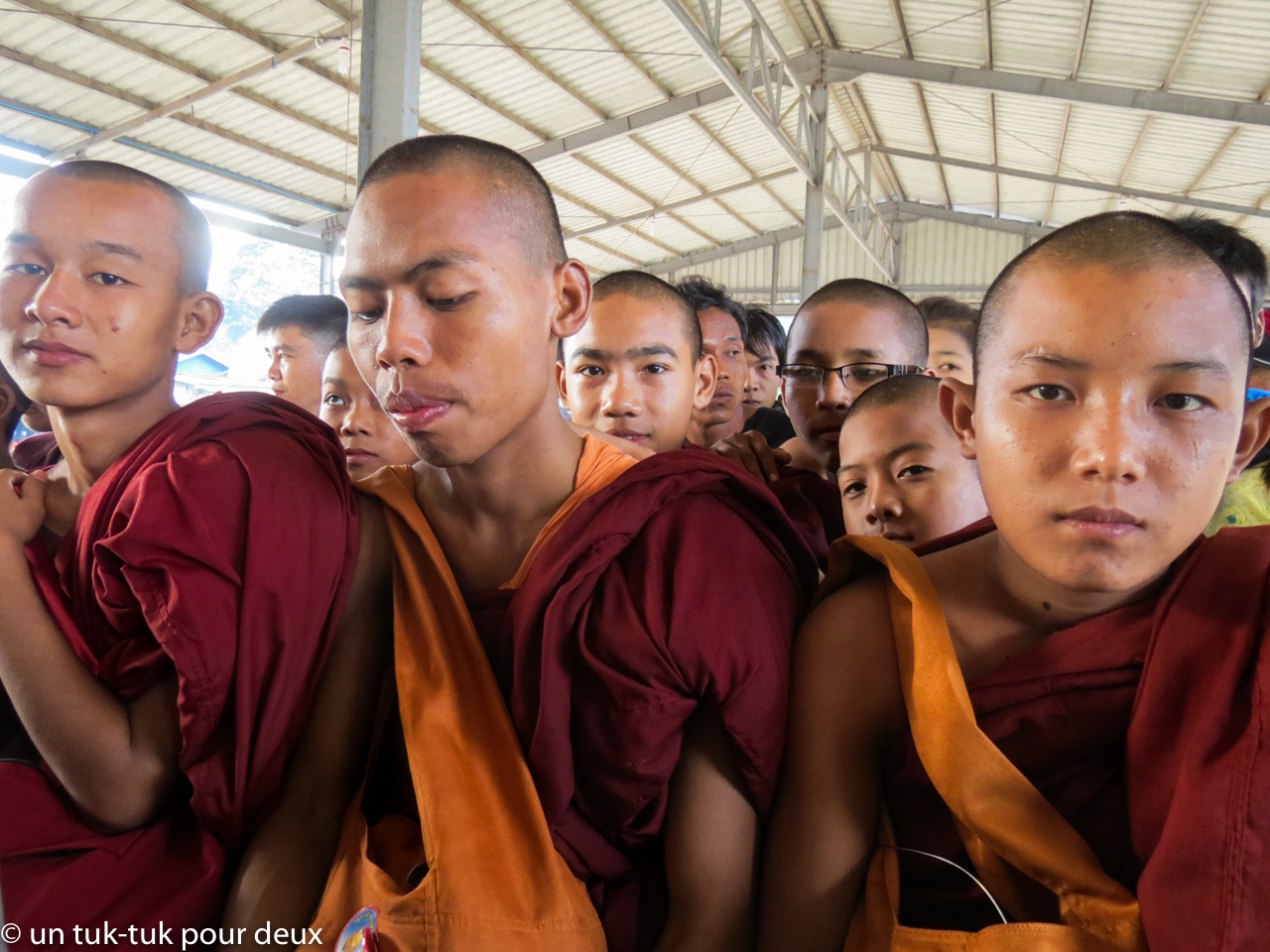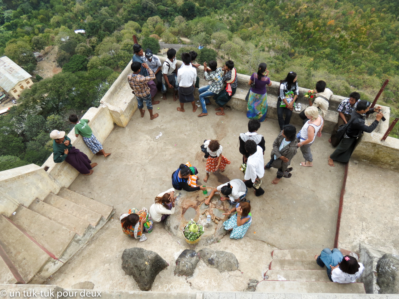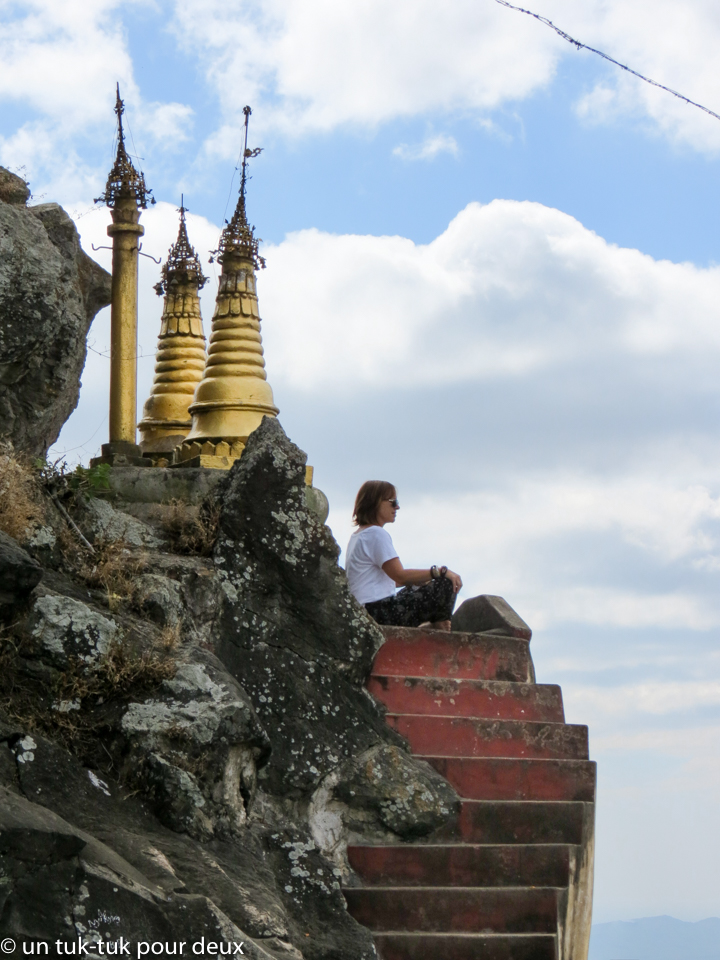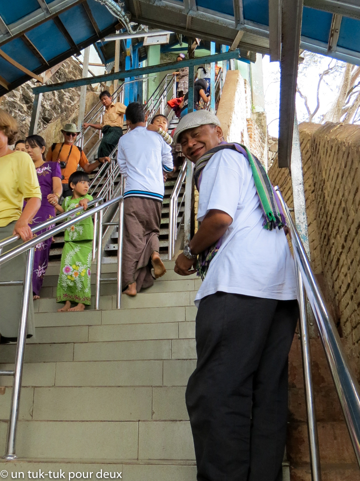Pour l’ascension, nous étions entassés à bord d’un camion local où nous sommes rapidement devenus le centre d’intérêt des jeunes bonzes embarqués avec nous. Au bout de trente minutes, les touristes à bord, en l’occurrence nous deux, devaient débarquer pour continuer à pied alors que tous les autres passagers sont demeurés dans le camion pour se rendre jusqu’au sommet. Nous n’avons d’ailleurs jamais su pourquoi, mais notre interprétation est que le trajet est trop dangereux et risqué pour la sécurité des touristes alors que celle des Birmans ne figure probablement pas parmi les priorités du gouvernement… m’enfin!