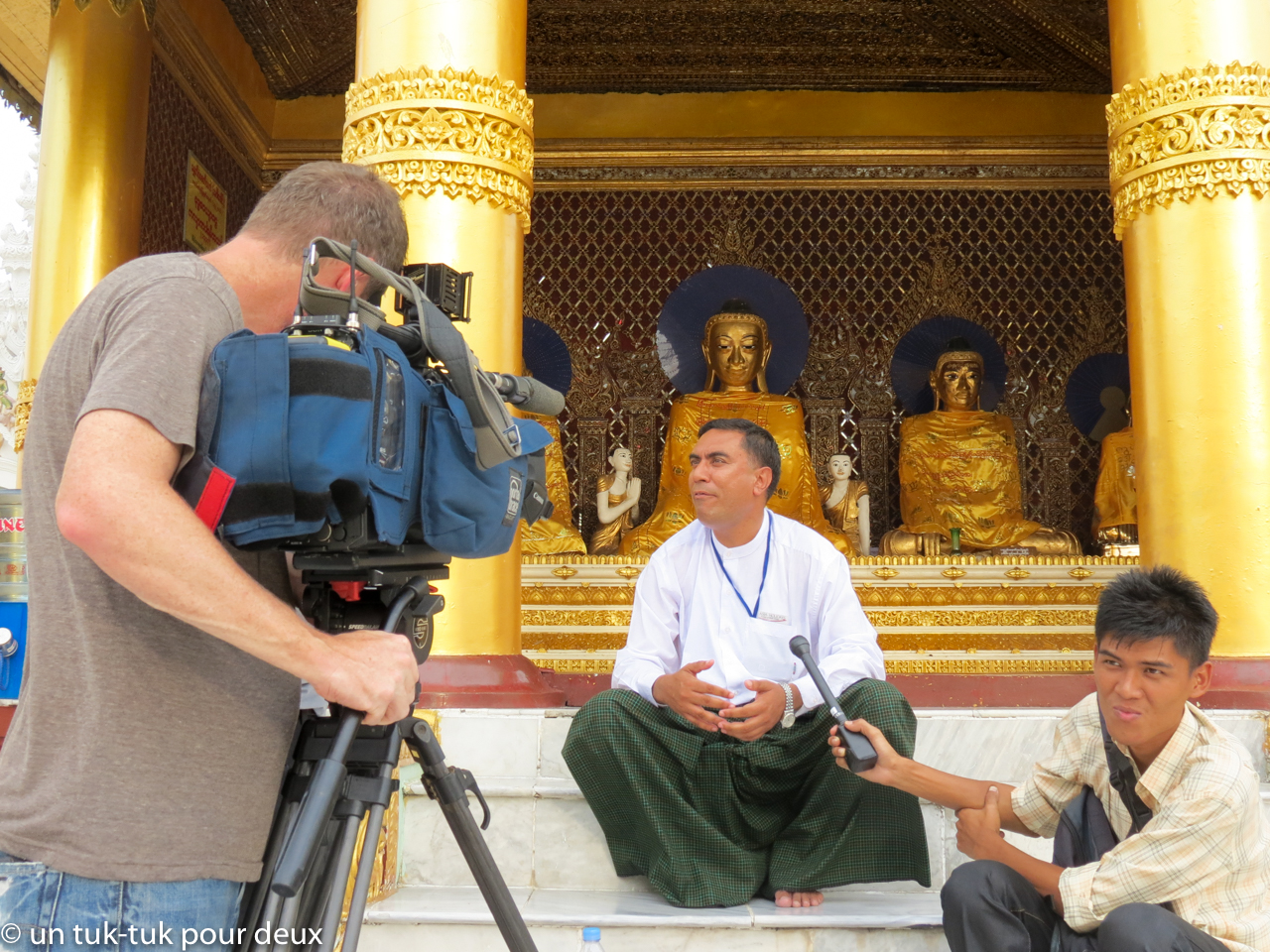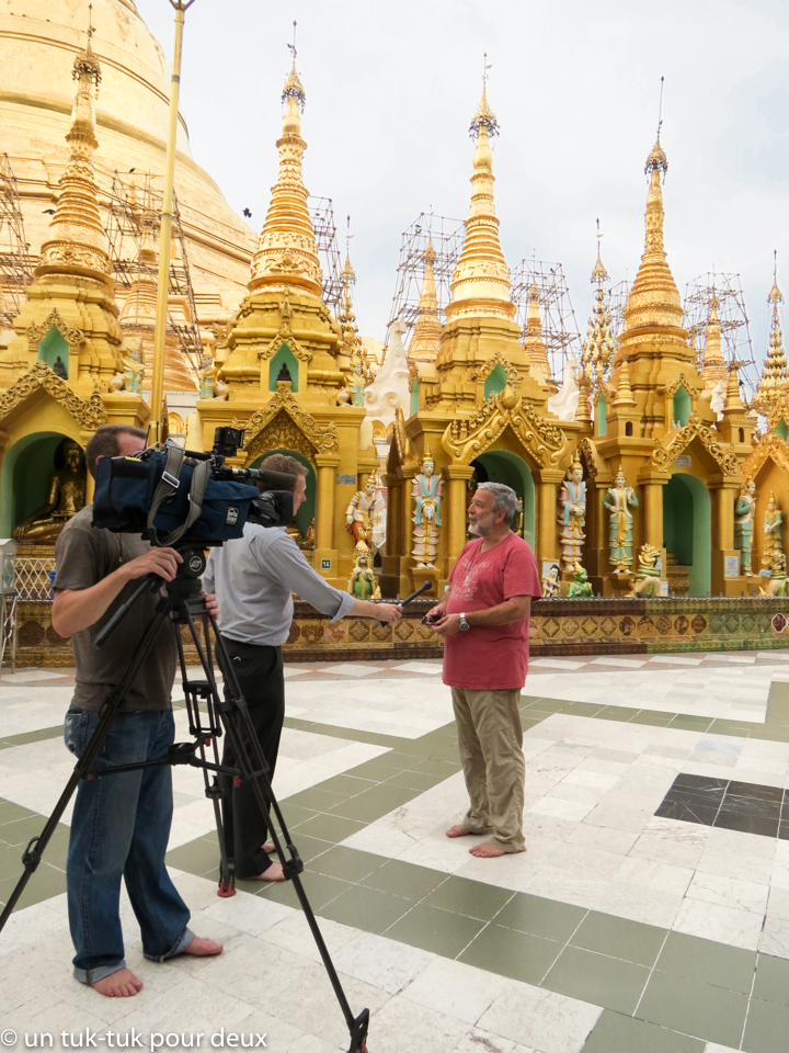 Petite anecdote : notre arrivée au Myanmar a coïncidé avec la visite de Barack Obama au pays, la première visite d’un président américain en 50 ans. Imaginez tout le branle-bas de combat partout dans la capitale! Rues fermées, militaires partout et tout le monde ne parlait que de ça. Il y avait aussi des journalistes du monde entier dans la capitale tout comme au Temple d’Or au moment de notre visite. Un journaliste du réseau BBC d’Angleterre a même interviewé Jean-Pierre, comme rare touriste occidental et notre guide. Le journaliste se demandait pourquoi des touristes visitaient ce pays alors qu’il était à peine rouvert aux étrangers. Belle expérience, mais malheureusement nous n’avons jamais réussi à voir le reportage.