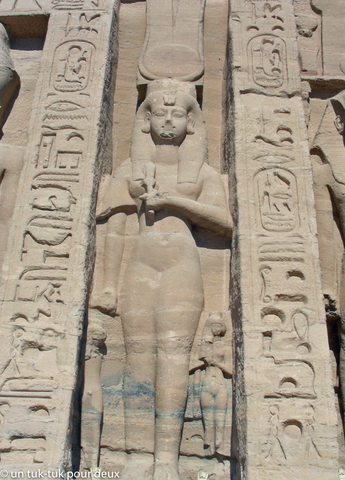 Façade du temple de Nefertari, elle est représentée par la déesse vache Hathor