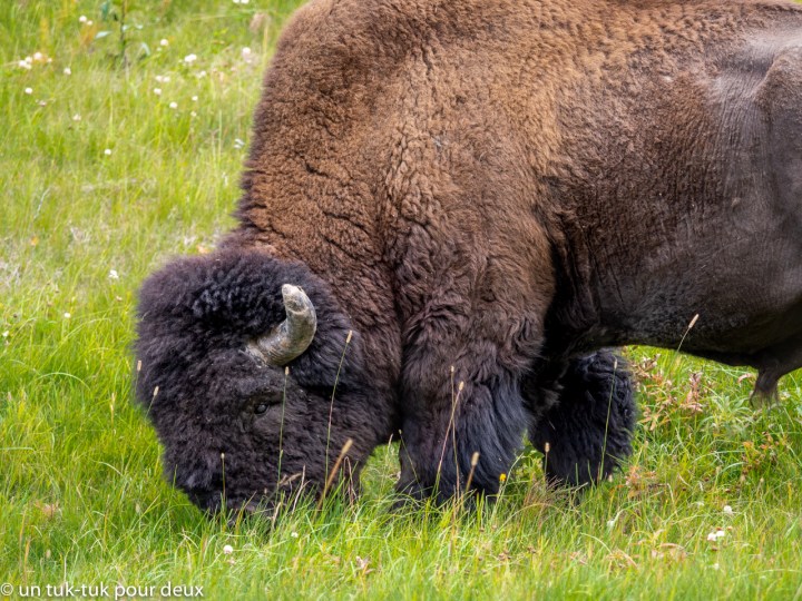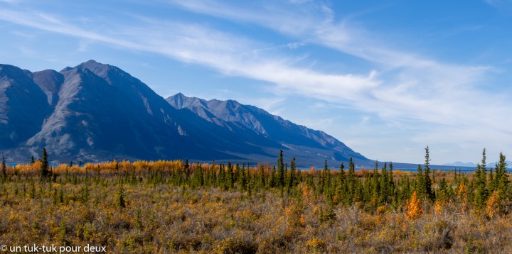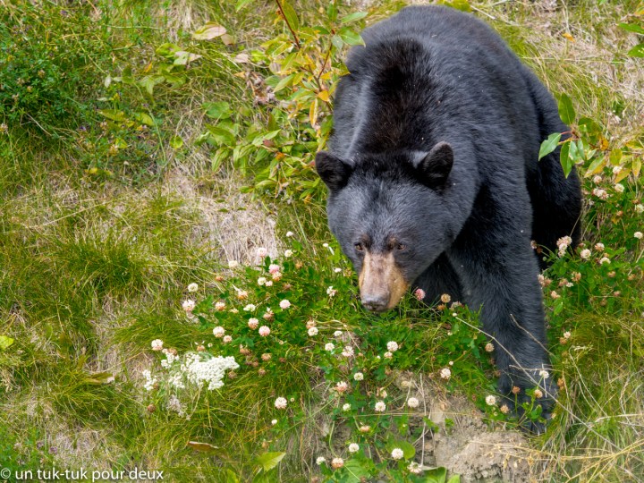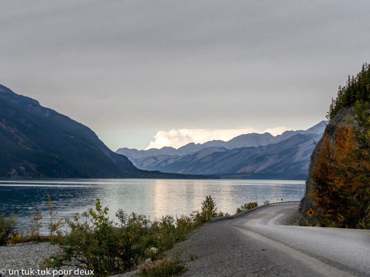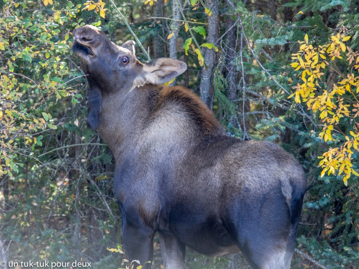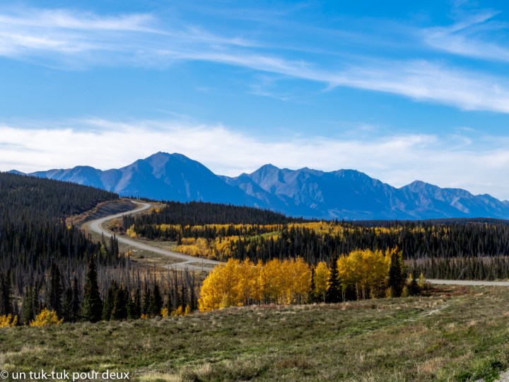 Puis, ce fut la route de l’Alaska qui a été construite pendant la Deuxième Guerre mondiale afin de permettre aux Américains de monter du matériel militaire en Alaska par voie terrestre. Elle commence à Dawson Creek au nord de la Colombie-Britannique, passe par Whitehorse au Yukon et se termine à Fairbanks en Alaska. Au total 2 332 km. La route est belle en général mais particulièrement, entre Fort Nelson (Colombie-Britannique) et Teslin (Yukon) (avis aux motocyclistes). C’est dans ce tronçon que nous avons rencontré l’ensemble de nos animaux, qui ne venaient même pas du zoo de Saint-Félicien 😜.