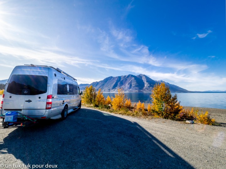 Camping Congdon Creek – Petit terrain sur le bord du très grand et beau lac Khuane. Places limitées, après 17 h en septembre, le camping était quasi complet. 12 $US/nuit, sans service, toilettes sèches et eau potable à la pompe. Il y a un emplacement sécurisé (anti ours) obligatoire pour les tentes.