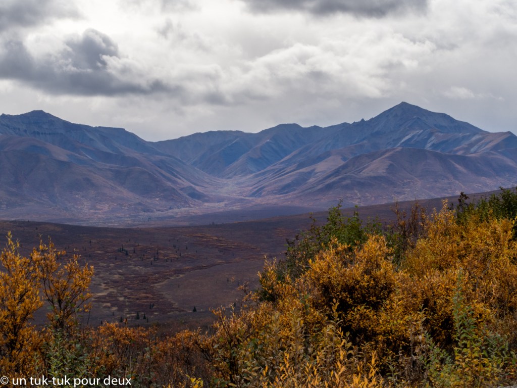 Deuxième journée au Denali. Très déçus de n’avoir pas pu randonner la veille et qu’il n’y a pas vraiment de sentiers balisés de plusieurs kilomètres dans le parc, mis à part ceux qui ne sont pas accessibles au Eilson Visitor Center; et vu le grand nombre d’ours aperçus la journée précédente, nous avons un peu manqué de courage pour faire du hors-piste. Nous nous sommes donc rendus au belvédère du Polychrome Overlook (km 72) en bus évidemment! Pour ensuite marcher une douzaine de kilomètres sur la route jusqu’à Toklat River, clochette à ours et Bear spay (très fortement recommandé dans les guides et par les rangers) à la portée de main dans la poche de côté du sac à dos. Cela nous a permis de mieux apprécier la beauté des paysages du parc sans face-à-face avec un ours ;-). Puis un retour en bus qui fut assez occupé par la vue de plusieurs animaux, dont encore quelques ours et des orignaux.