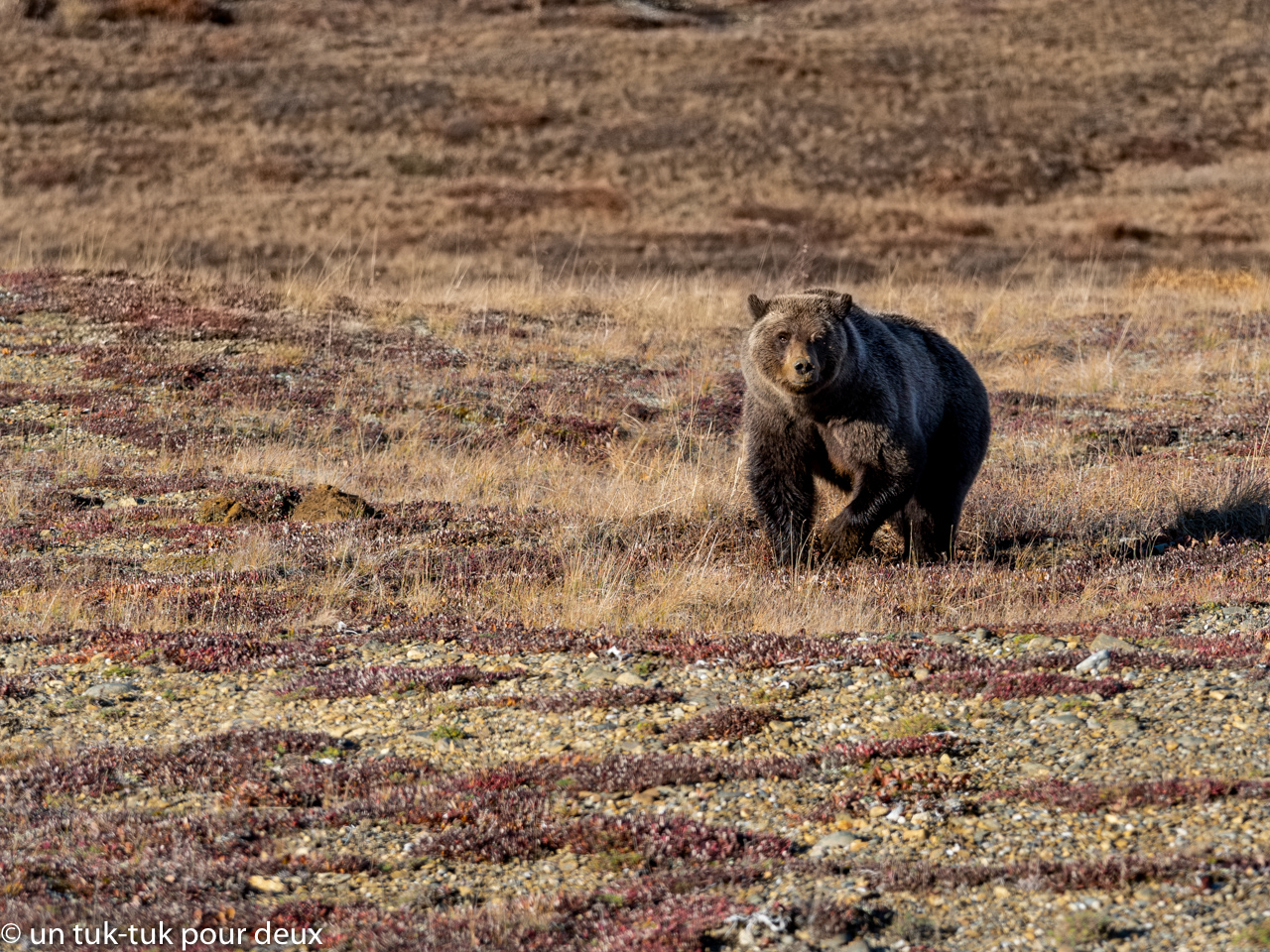 Nous remontons dans le bus en nous disant qu’on devrait s’arrêter à nouveau au Eielson pour manger, prendre notre temps, admirer le Denali puis rentrer avec le bus suivant. Arrivés au fameux arrêt, tout le monde est sur le bord du stationnement, deux ours sont dans les environs et personne ne doit d’éloigner. Ils sont un peu loin, mais nous les voyons très bien.
