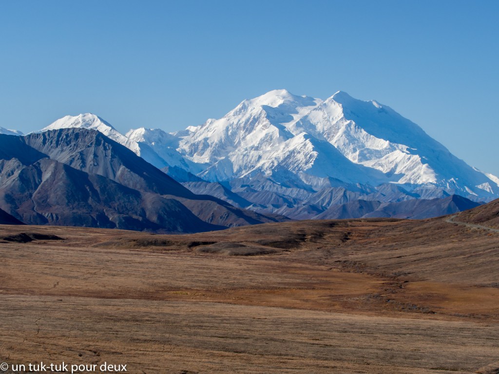 Les points positifs de la première journée : le parc est très très beau et pour notre grand bonheur le fameux mont Denali a bien voulu se dévoiler dans toute sa splendeur durant la journée complète. Ce qui, selon les guides, n’arrive qu’un jour sur quatre en moyenne. En plus, nous avons eu droit à plusieurs arrêts photos, tant pour les paysages que pour les animaux, dont plusieurs ours bruns, des orignaux et des dall cheep (espèce de chèvre de montagne blanche), mais celles-ci toujours de très très loin.