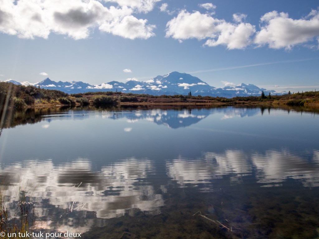 Nous décidons donc, après discussion avec un habitué du parc, de remonter et d’aller jusqu’au Wonder Lake, point ultime du trajet du bus. Il y a un spot appelé Reflexion Pound et il semble que par beau temps, on y voit le Denali s’y refléter (c’est logique!). Il faut donc descendre du bus juste avant le Wonder Lake et marcher environ 20 minutes pour le rejoindre. Voici le résultat, ce n’est pas la réflexion parfaite, mais ce n’est pas mal non plus.