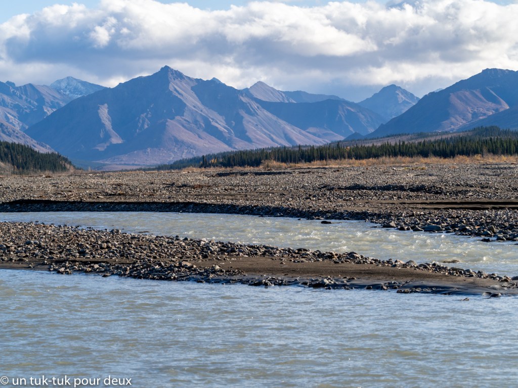 Afin de contenter un peu notre envie de nous dégourdir les jambes, nous descendons à l’arrêt Teklanika River et marchons dans le lit de la rivière jusqu’à notre camping, soit deux petits kilomètres.