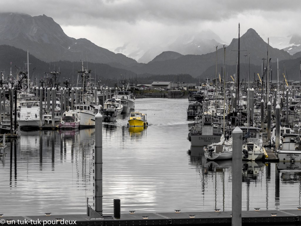 Mais bon, le spit, extrêmement populaire en été et il est réputé pour être LA place le fun en Alaska. Ce qui n’est pas étonnant avec tous ses hôtels, restaurants, condos, boutiques de souvenirs, campings (stationnement pour VR) pour la plupart fermés en cette période évidemment et sa superbe marina de centaines de bateaux de pêche et de plaisance.