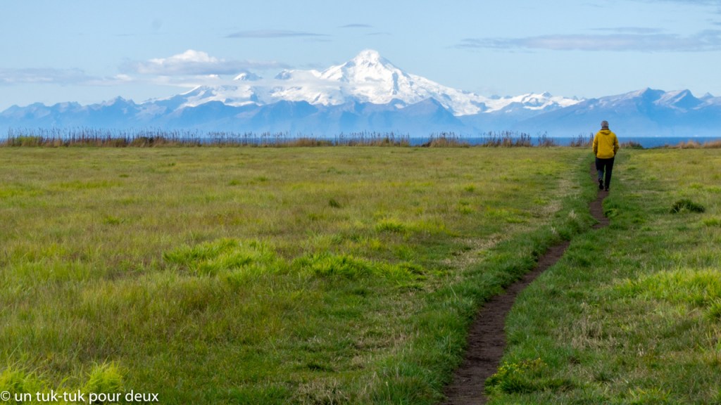 Prochaine étape dans notre périple, la petite ville de Homer située de l’autre côté de la péninsule de Kenai. Homer compte moins de 6 000 habitants qui vivent au rythme de la pêche et du tourisme. Ce qui la définit est son immense banc de sable de près de sept kilomètres, appelé The spit, qui vient fermer en partie la baie de Kachemak. Pour celles et ceux qui connaissent la Gaspésie, ça ressemble aux barachois de Bonaventure, Paspébiac, etc., mais en beaucoup plus long. Évidemment c’est américain… 😀