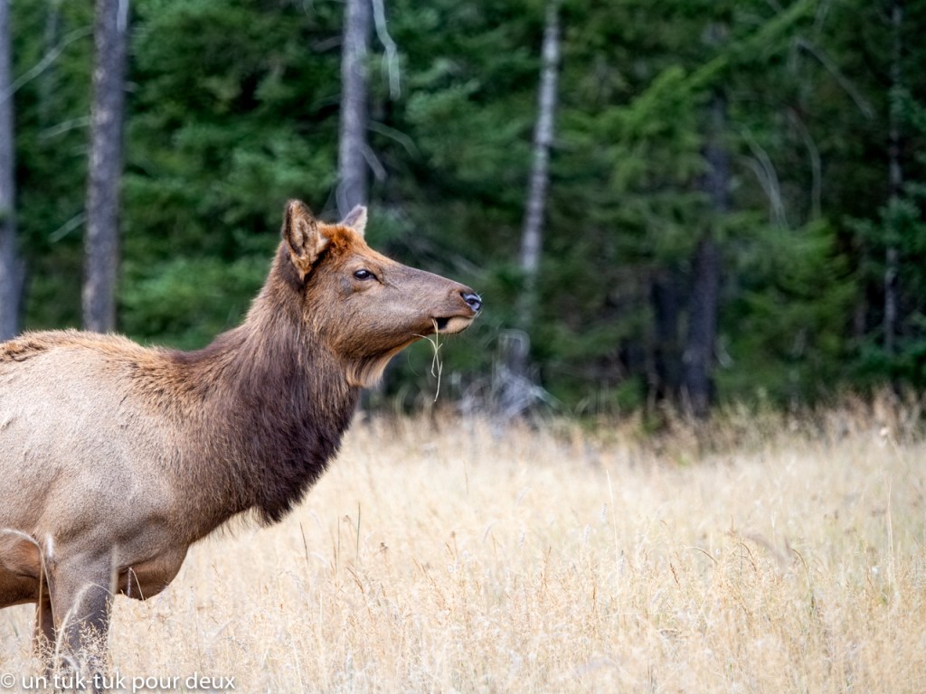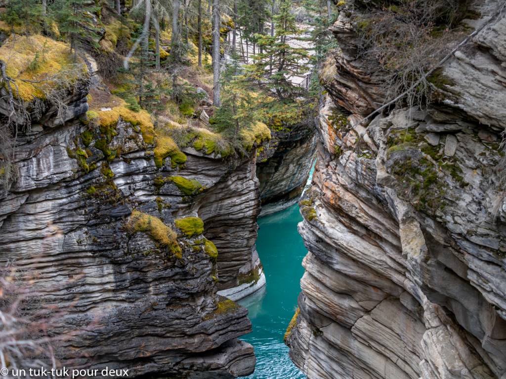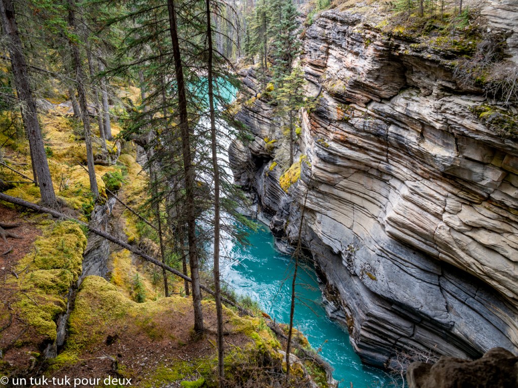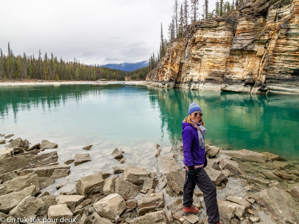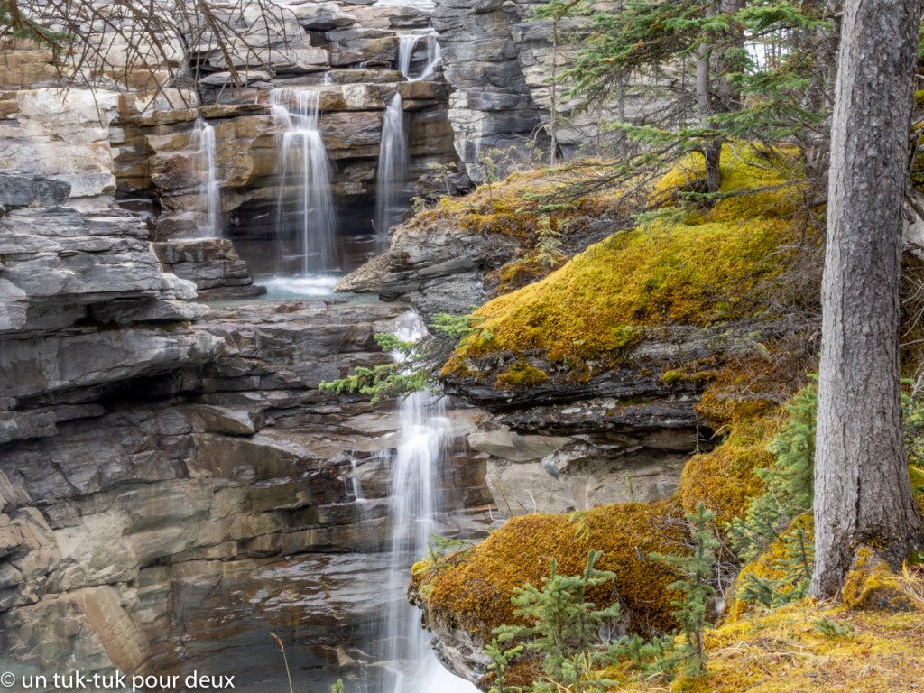 Tout en contemplant encore et toujours les paysages et après nos premières rencontres avec les chèvres de montagne et les wapitis, nous nous arrêtons aux chutes de la rivière Athabasca à environ 15 km de Jasper.