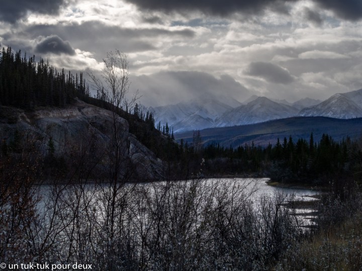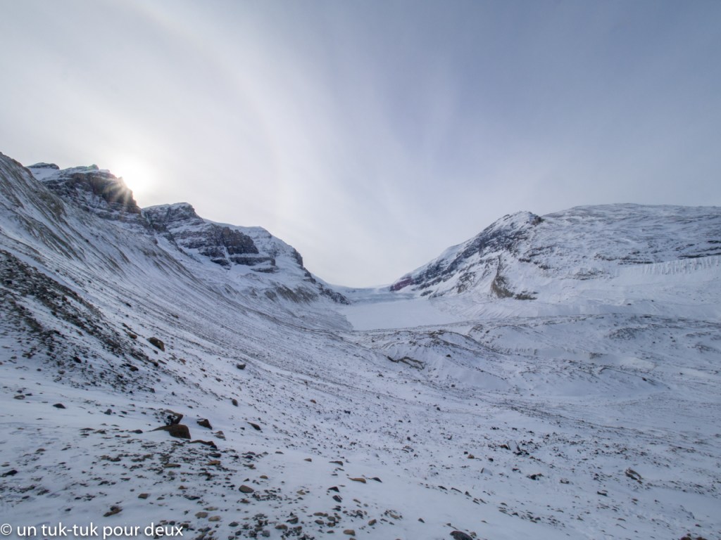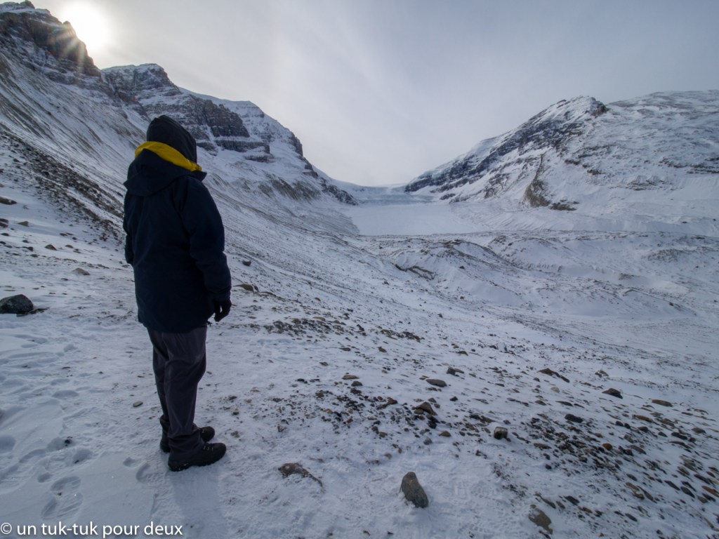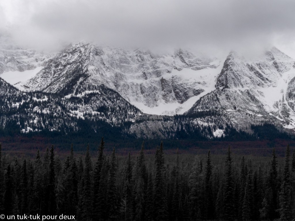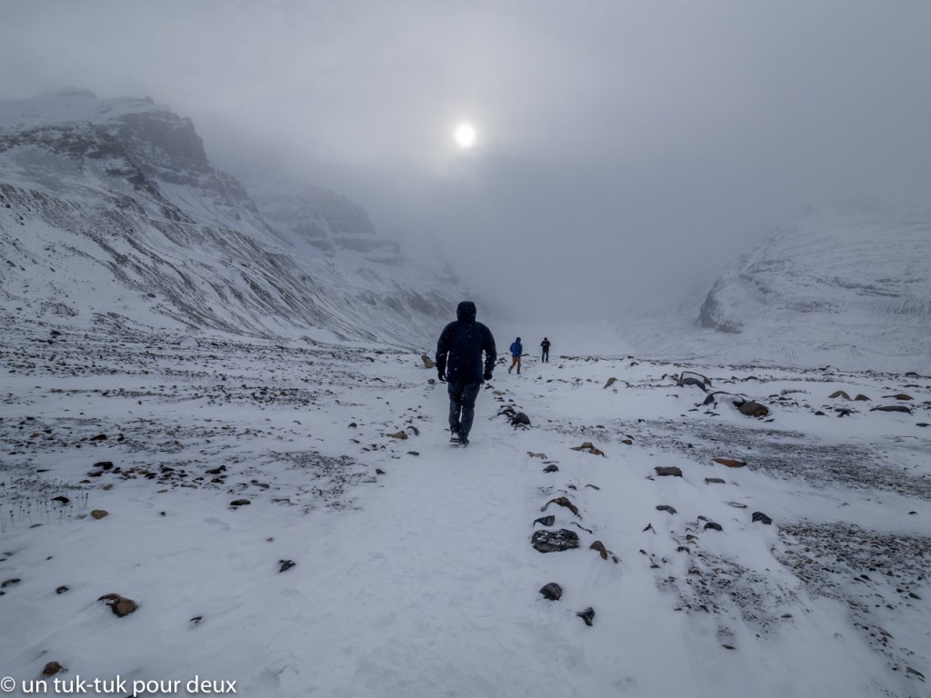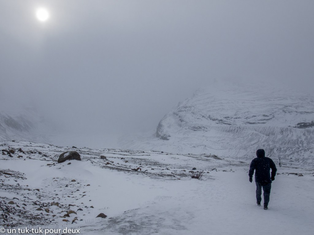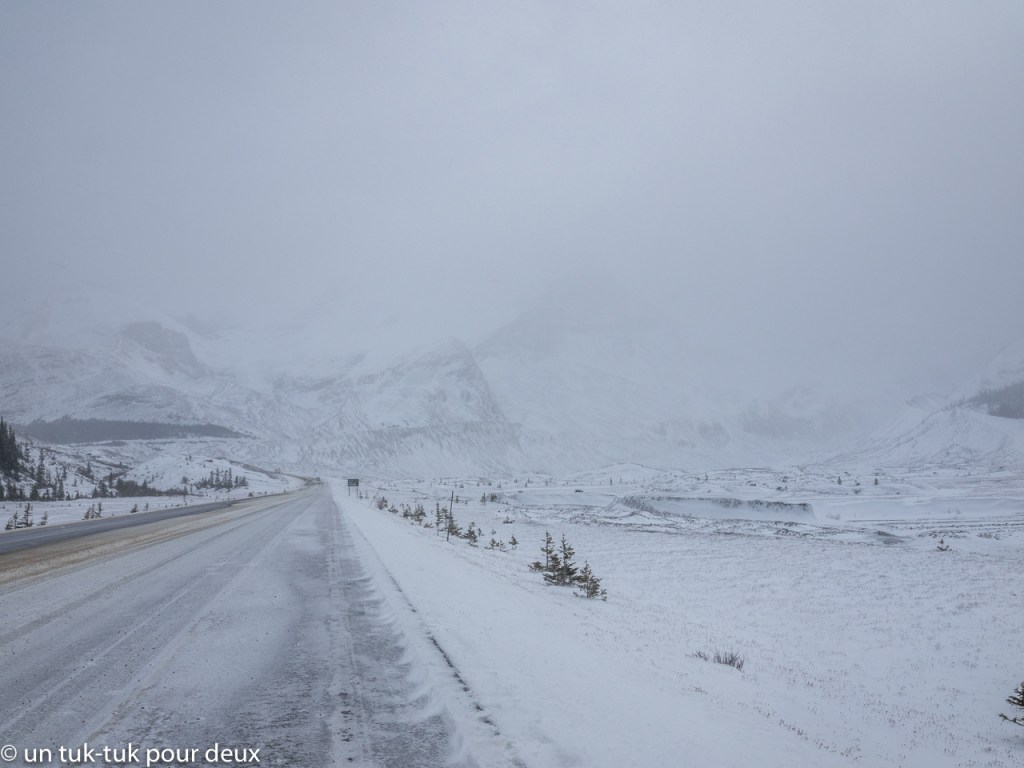 Nous poursuivons notre chemin vers le Champ de glace (Icefield) de Columbia. Mais là, nous sommes très haut dans les montagnes, il neige, la route est glissante et le paysage est d’un autre monde. En fait, on dirait la fin du monde!