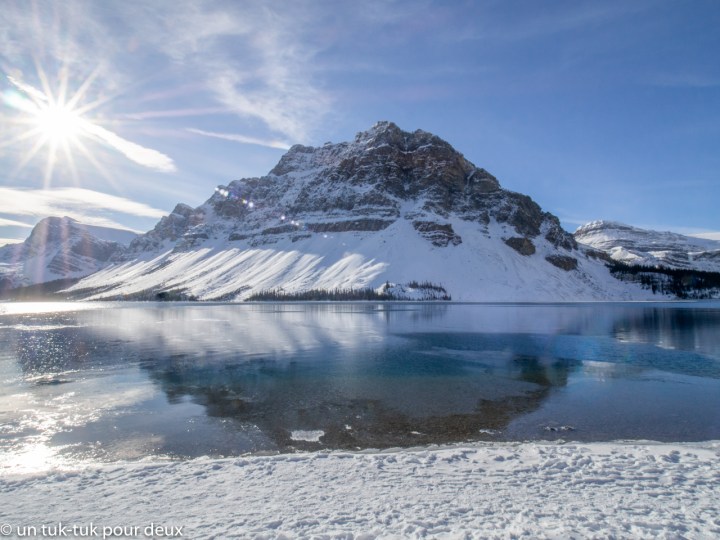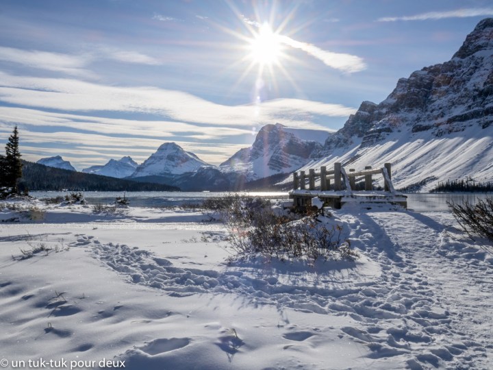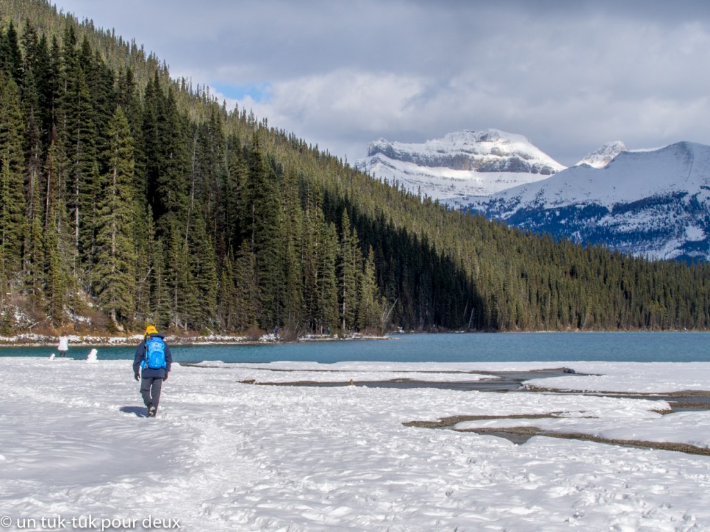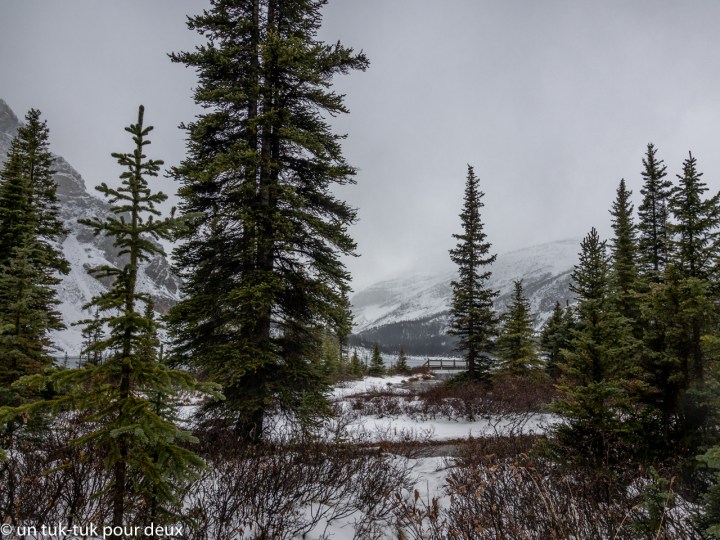Un autre tantôt, nous repartons vers le nord sur la Promenade des glaciers pour nous rendre au Glacier Bow et au lac Bow, situé à 100 kilomètres de Banff. Il a de nouveau neigé la nuit précédente et la température oscille autour du -5 degrés. Nous marchons quelques kilomètres aux abords du lac, qui commence à geler. Encore une belle destination. Nous y reviendrons une deuxième fois pour le voir sous le soleil. Et cette fois-ci, contrairement au Glacier Columbia, nous privilégions l’expérience par beau temps.