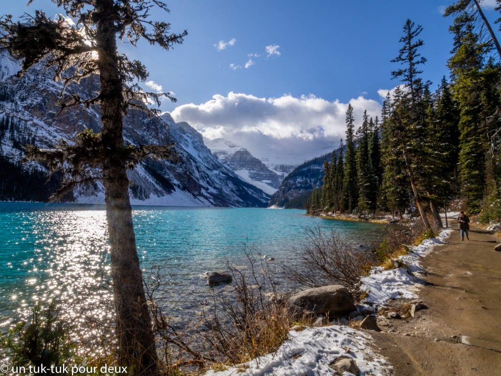 Et qu’en est-il du légendaire lac Louise, nous y arrivons enfin. Nous ne pouvions en faire abstraction c’est bien certain, même si nous nous attendions à être déçus vu sa très grande popularité. Tsé! Les réputations surfaites de certains sites, on en a vu très souvent. Nous y faisons donc un saut par une journée assez ensoleillée. Une petite marche de quelques kilomètres vers les glaciers en amont du lac permet de le voir, lui et son fameux Château Fairmont sous tous leurs angles. C’est vrai que c’est beau, mais victime de sa notoriété, il y a beaucoup (trop) de monde (même hors saison, on n’ose pas imaginer en haute période d’achalandage). C’est quand même phénoménal que le Canadien Pacifique ait « découvert » cet endroit, qu’il y ait installé des camps de pêche, construit le château (en 1890) et même fait venir des alpinistes suisses pour organiser des randonnées en montagnes pour les touristes. C’était l’époque du début du tourisme pour les nantis!