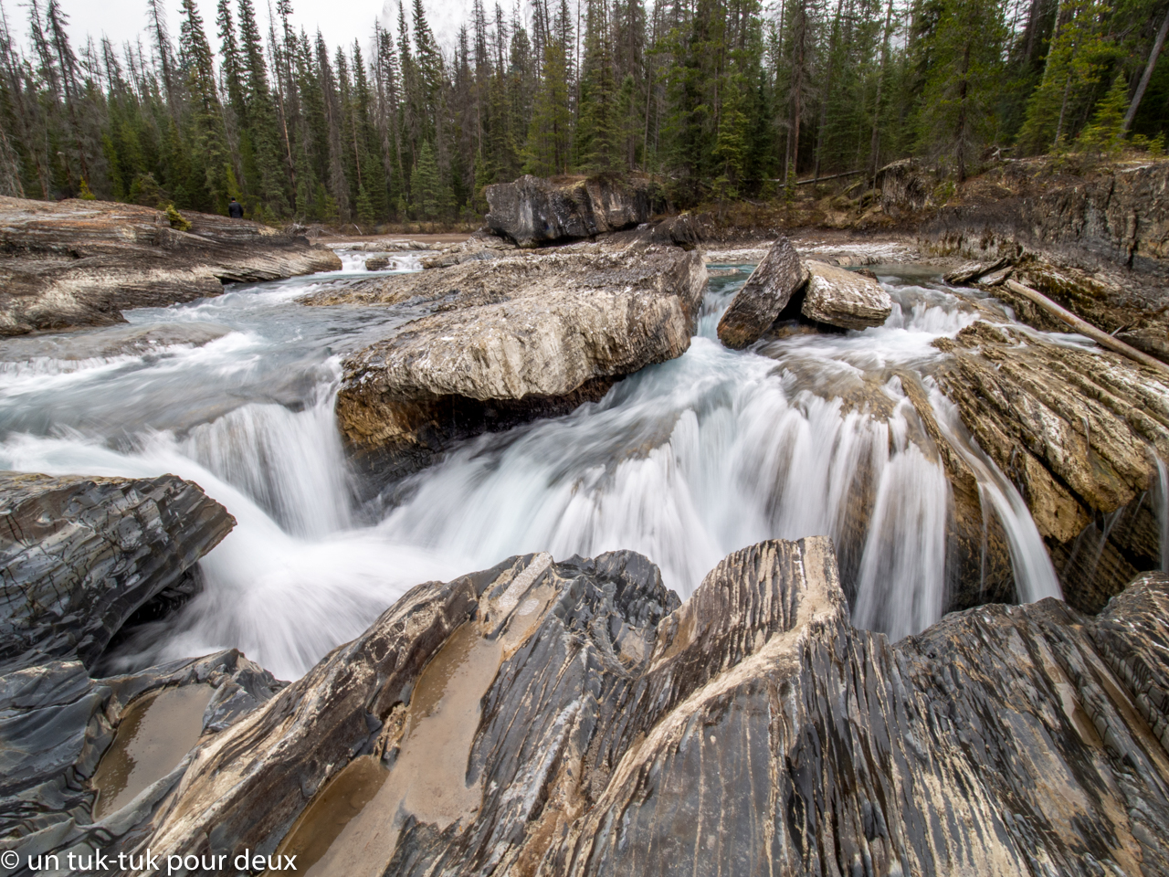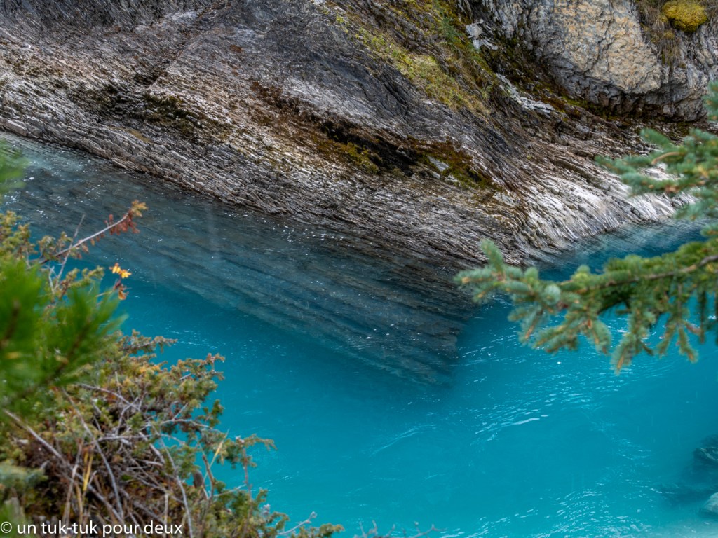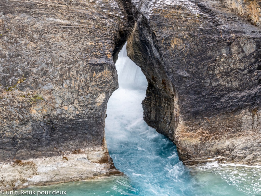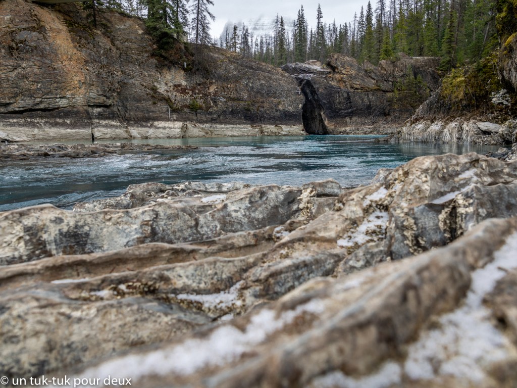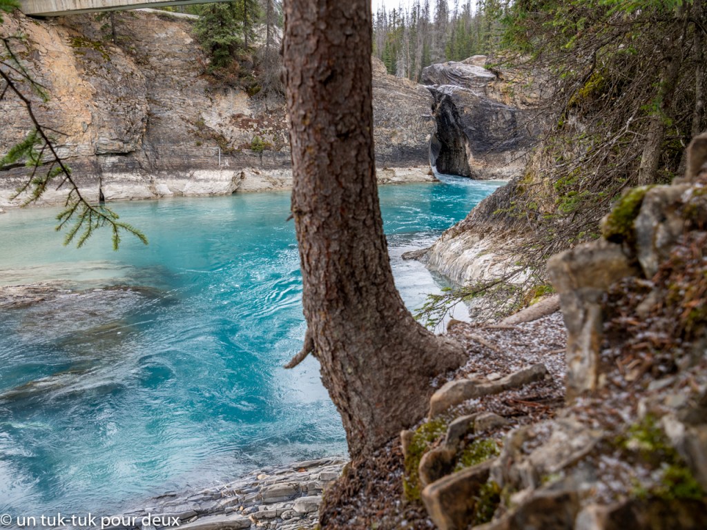 Une autre journée, nous nous aventurons dans le Parc national de Yoho, à 95 km au nord-ouest de Banff pour découvrir lac Emerald. Mais, avant d’y arriver, un arrêt au Natural Bridge juste après la petite ville de Fields s’impose. La rivière Kicking Horse fraie son chemin là où elle veut bien et nous éblouit par ses capacités de creuser la roche. Une merveille de plus de la région!