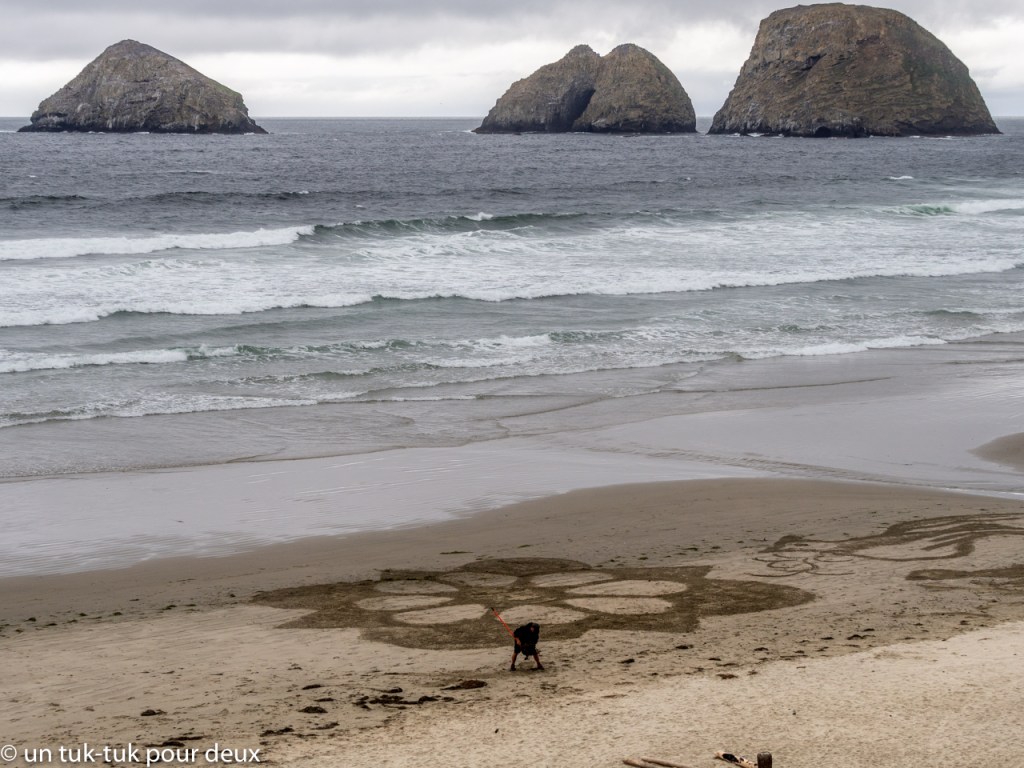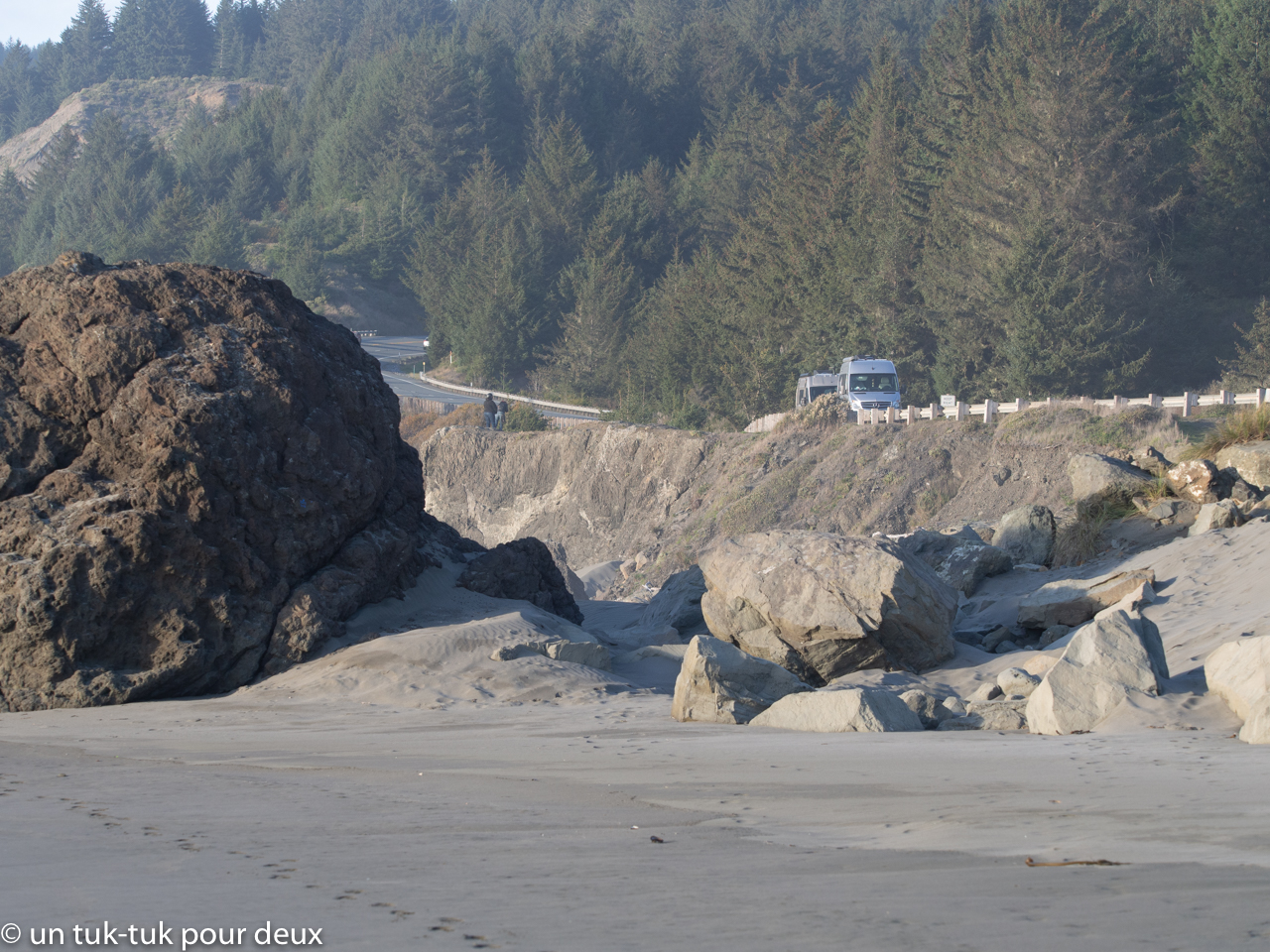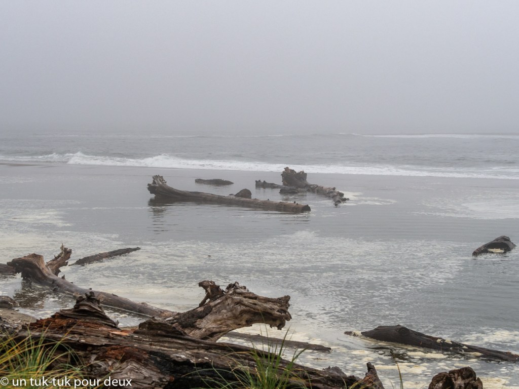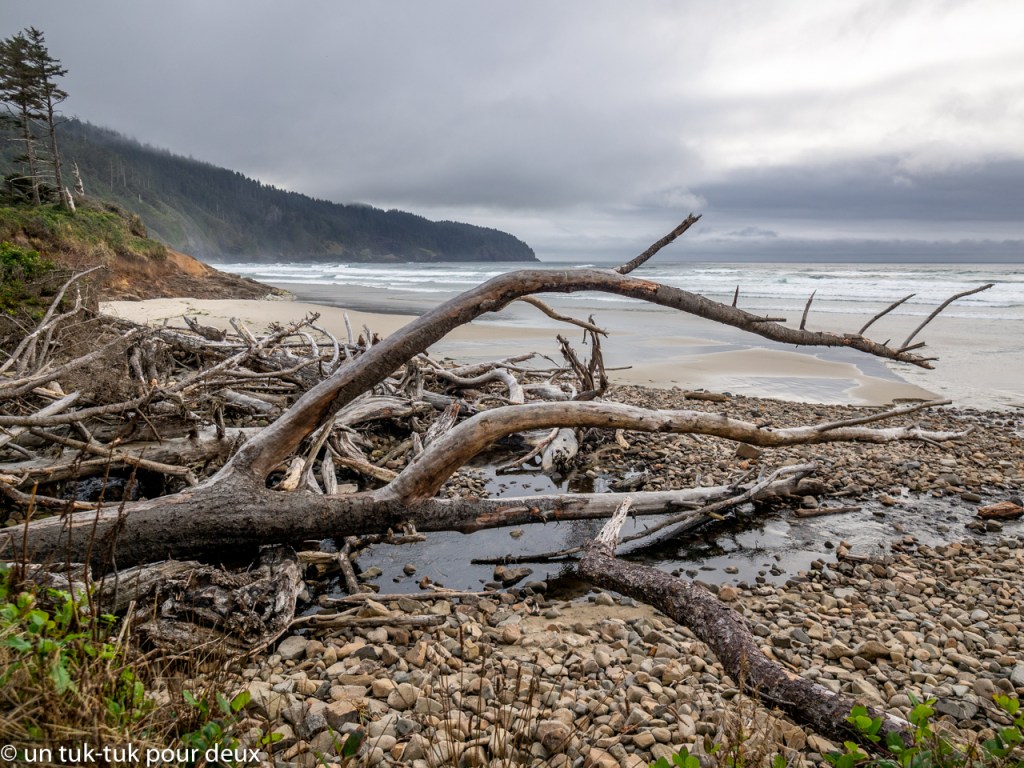 Un arrêt pour ravitaillement à Lincoln City s’impose, mais aussi parce que ça nous tente de jouer les touristes. Il faut savoir qu’entre la mi-octobre à la fin mai, des bulles (flotters) en verre soufflé sont déposées au hasard sur la plage pour attirer les touristes. Celles et ceux qui en trouvent une repartent avec un souvenir unique que l’artiste authentifie à son atelier. Même si le gentil monsieur du centre d’information nous a mentionné qu’il n’y en aurait sans doute pas la journée où nous y étions en raison de la température, nous prenons quand même plaisir à parcourir la plage recouverte de bois flotté. On a bien marché plus d’une heure à la recherche de l’un de ces petits joyaux, mais en vain. Pas grave, l’exercice valait la peine malgré le temps un peu moche.