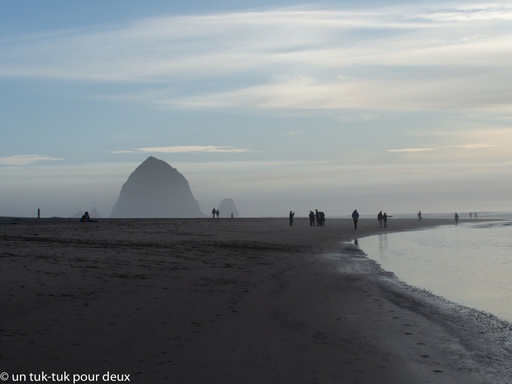 Nous nous dirigeons par la suite vers Cannon Beach qui selon le Lonely Planet est l’une des stations balnéaires les plus appréciées de l’Oregon. Nous avons d’ailleurs lu il y a quelques jours qu’elle figurait au palmarès des 10 plus belles plages au monde du National Geographic!!! C’est effectivement une très belle plage, très large, et à perte de vue et on comprend pourquoi elle est si aimée. Mais de là à dire qu’elle se retrouve dans ce palmarès, nous avons quelques réserves à ce sujet. Néanmoins, nous y avons longuement marché et admiré les formations rocheuses, dont le fameux Haystack Rock très photogénique.