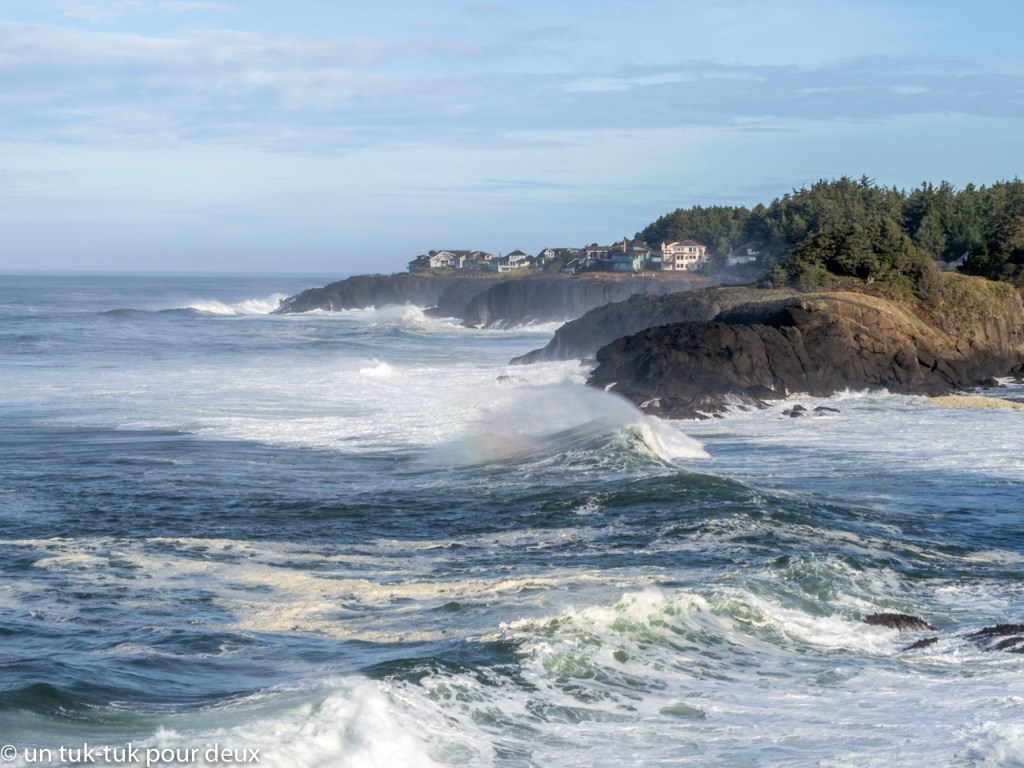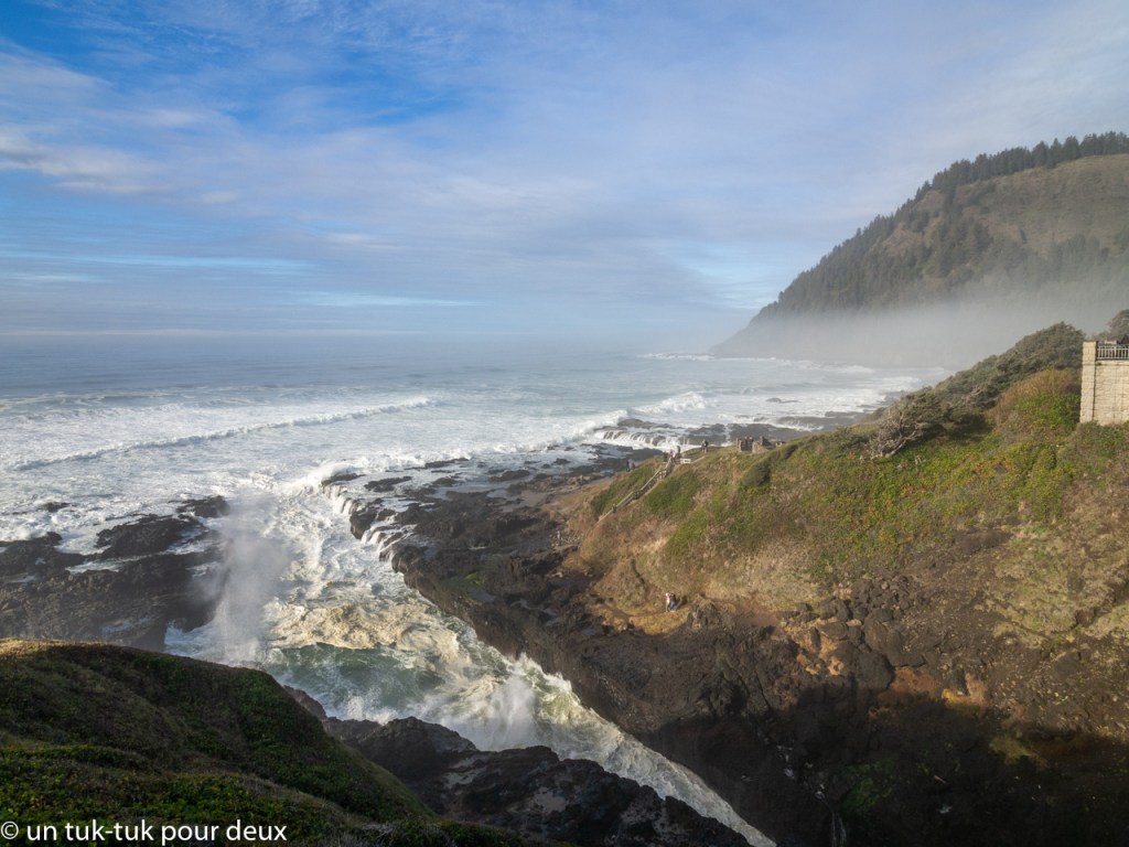 Revenons à notre but, il nous attendait un peu plus loin et ce fut le clou de la journée. C’est un endroit spectaculaire appelé Devil’s Churn sur le Cape Perpetua. Les plages y sont recouvertes de pierres volcaniques pleines de trous par où pénètrent les vagues qui forment des geysers marins. Un spectacle « haut » en couleur que nous avons regardé pendant quelques heures en compagnie de plusieurs dizaines de touristes.