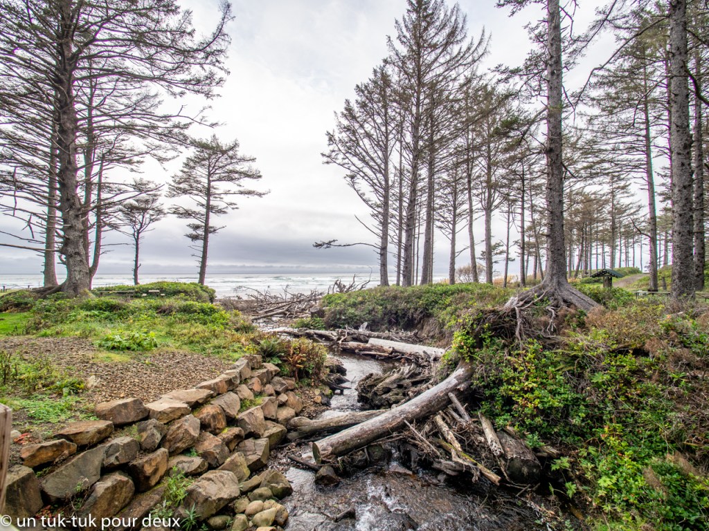 Astoria — Fort Stevens State Park — Beau, grand, rues et emplacements asphaltés, immenses arbres. 32 $ US tous les services inclus (le prix du camping inclut aussi l’accès aux parcs nationaux pour toute la journée), bac de récupération sur le camping. Très tranquille (hors saison et en semaine). Note : le boondocking n’est pas vraiment possible à Astoria.