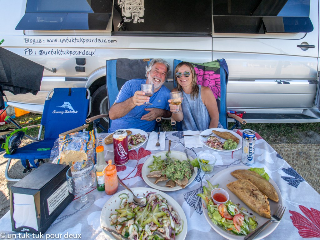 Certains campeurs (Canadiens et Américains) rencontrés se sont « quasi approprié » des terrains, y ont construit des plateformes et de grands palapas qu’ils utilisent comme coin repas et pour se prélasser bien à l’abri des rayons du soleil. Les VR ne servant qu’à dormir. Ils y passent l’hiver, et ce, depuis plusieurs années, sans rien payer. Et même s’il n’y a personne dans les emplacements, on ne peut pas vraiment s’y installer, car les autres voisins surveillent. C’est un peu aberrant, d’autant plus qu’ils occupent la plus belle partie de l’endroit, à l’extrémité de la baie.