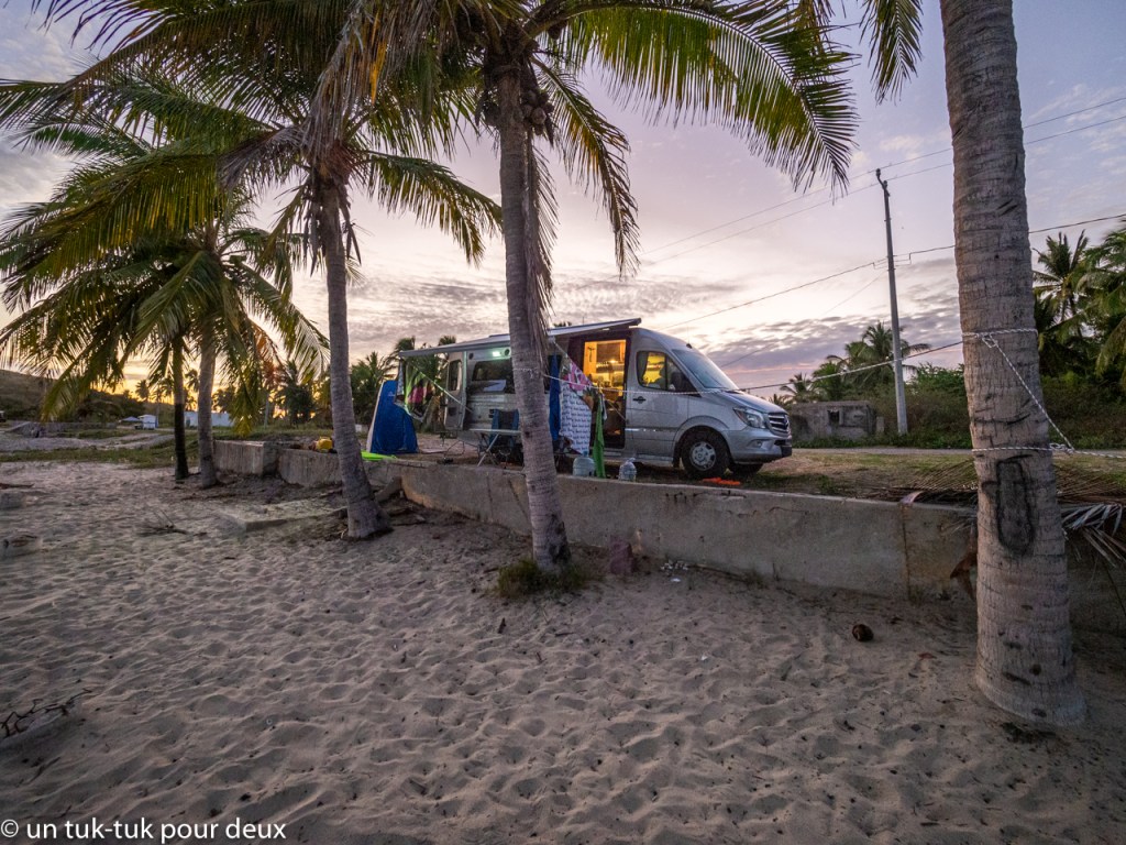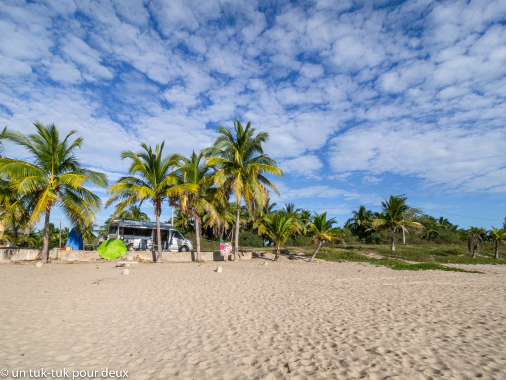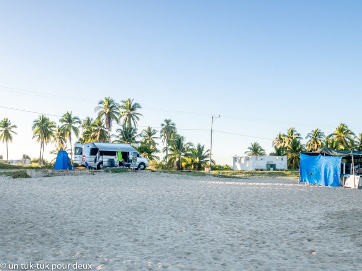 Mais plutôt que de s’installer sur le stationnement comme indiqué dans les commentaires sur iOverlander, nous décidons que le long de la plage avec la porte de côté donnant directement sur le sable est un meilleur choix pour l’instant. « On verra demain! »