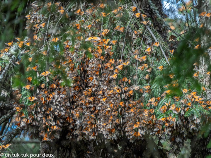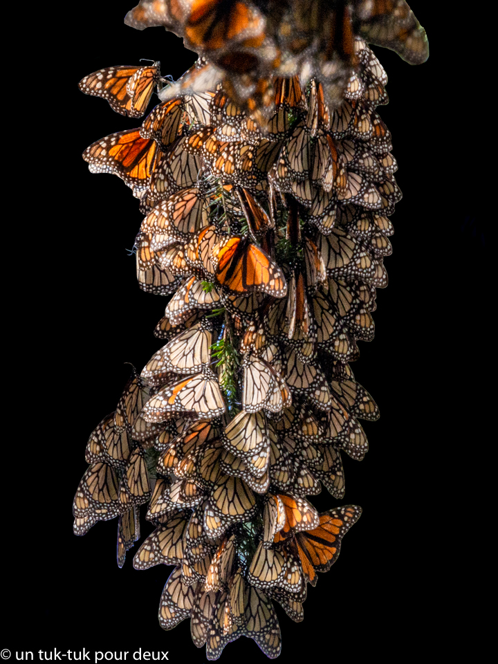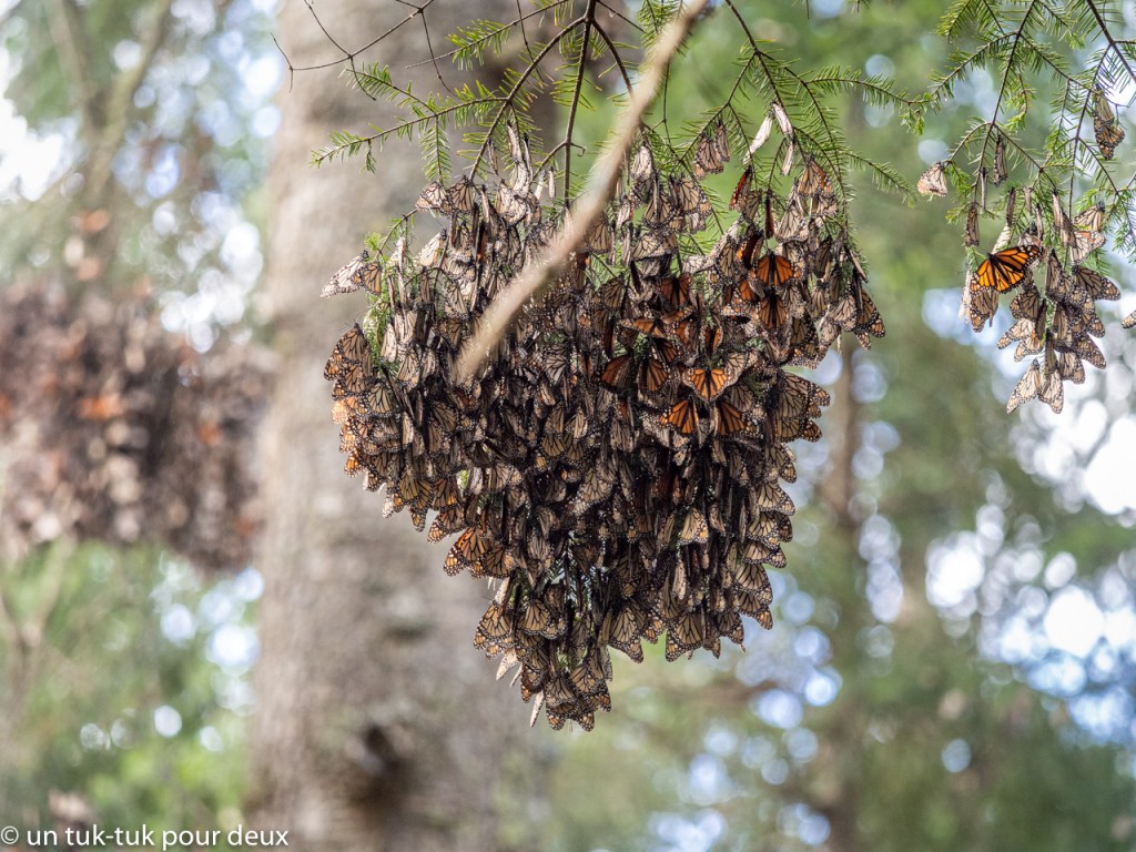 Au début, on n’y voit que des masses grisâtres suspendues aux arbres. C’est ça qu’il y a à voir! C’est spectaculaire tellement il y en a, mais c’est un peu tristounet quand même! Il faut vraiment porter attention pour distinguer les papillons.
