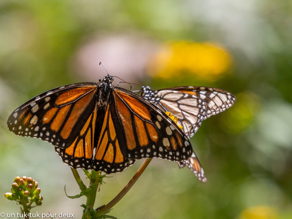 Par ailleurs, on est tous au fait que les papillons monarques sont menacés d’extinction et à cet effet, si cela vous intéresse, voici deux liens pour en apprendre plus sur l’espèce et pour savoir comment contribuer à leur survie. Le premier est bien sûr celui de la Fondation David Suzuki. Soyez avisés, il vous donnera sûrement le goût de participer à votre façon à L’effet papillon. Pour le second, il s’agit d’une coïncidence, car Radio-Canada diffusait il y a quelques jours un mini reportage de Jean-Michel Leprince sur une nouvelle colonie de monarques dans le Parque Nevado de Toluca au Mexique. Les papillons ont trouvé un autre refuge au Mexique pour leur migration, c’est fort intéressant.