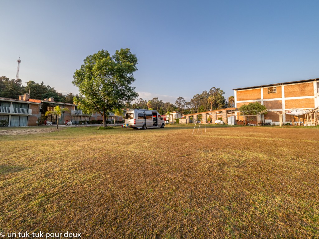 Malheureusement, comme il n’y a aucun service pour le tuk-tuk, avant de prendre la route pour Mexico, nous devons aller faire la vidange et le plein d’eau au seul autre camping des environs, le El Paraiso Trailer Park. Le propriétaire, un vieux monsieur déplaisant, nous a demandé 250 pesos, le prix d’une nuit sur place, pour ces services. Nous étions en beau fusil, mais pas d’autres alternatives!