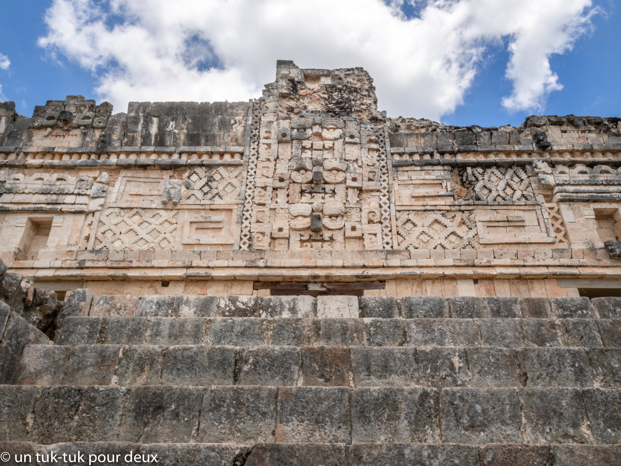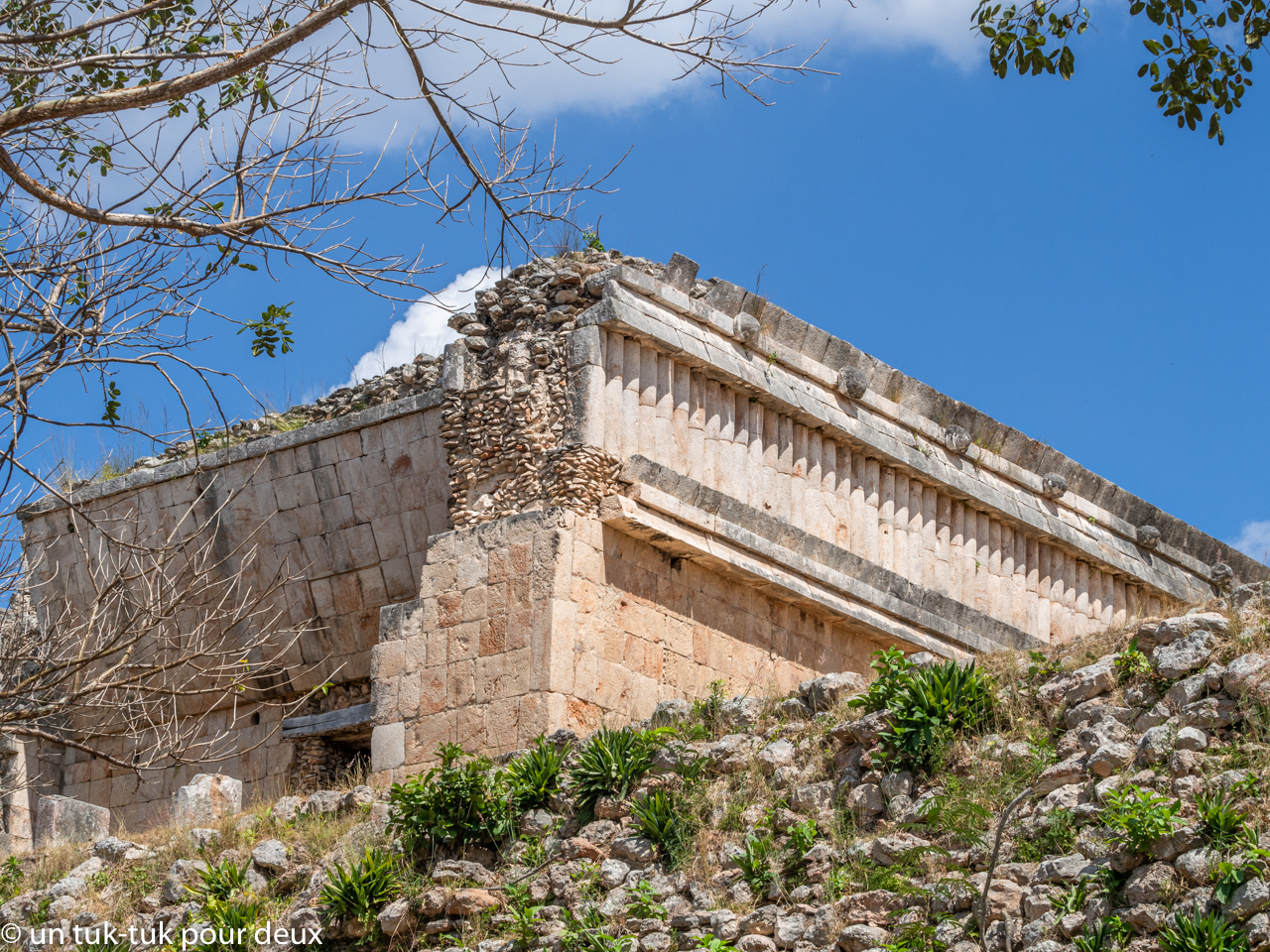 3. Le palais du Gouverneur, par la finesse de ses sculptures et le raffinement du bâtiment est considéré comme un chef d’œuvre de l’architecture Puuc. Il n’a rien à envier aux autres bâtisses du site ni à bien d’autres sites mayas. On suppose aussi, sans que cela soit confirmé, qu’à l’origine il devait faire partie d’un deuxième quadrilatère à l’instar de celui des nonnes. Plan qui aurait été abandonné par la suite.