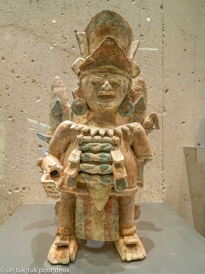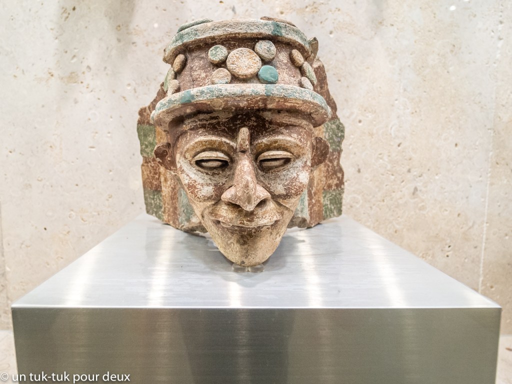 Après une journée de repos, nous nous rendons à Mérida, une ancienne ville Maya devenue la ville culturelle du Yucatán et qui compte plus d’un million d’habitants. En arrivant dans la ville, nous nous arrêtons au Gran Museo Del Mundo Maya, un immense musée anthropologique sur les Mayas. « Visite indispensable et enthousiasmante » selon Le Petit Futé, mais nous sommes réellement déçus surtout après avoir vu celui de México. Franchement pas de comparaison, même s’il contient quelques belles pièces. Et nos deux comparses qui n’ont pas visité le premier sont également désappointés. Alors, sans hésitation, on ne manque pas grand-chose en omettant cette visite si le temps nous est compté.