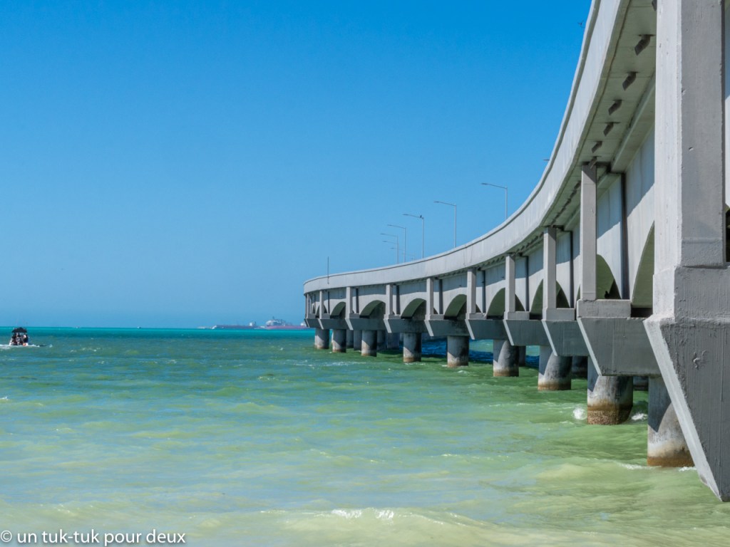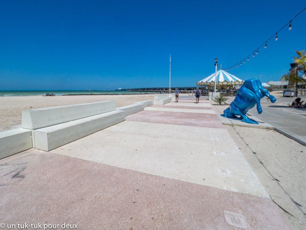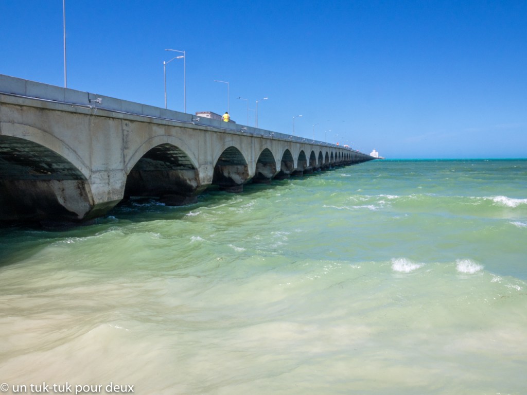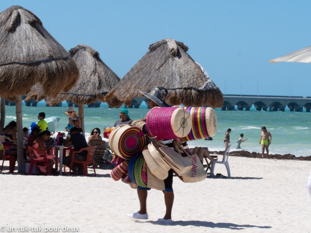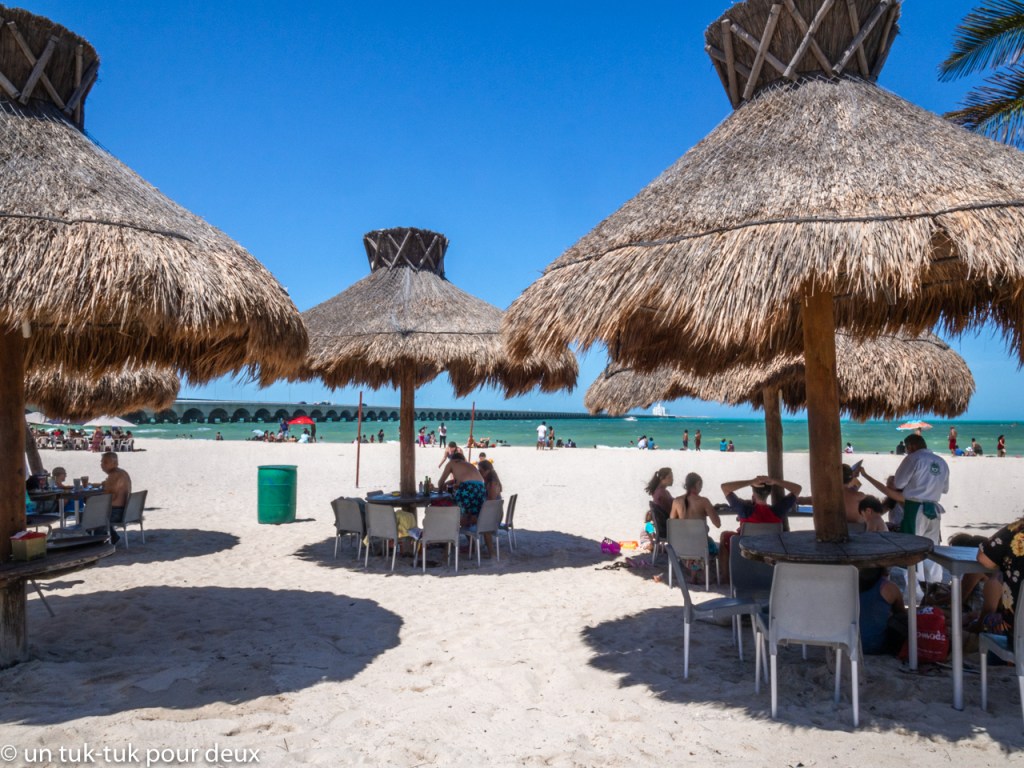 Pour notre dernière journée, nous allons explorer le centre touristique de Progreso, ville portuaire où de nombreux bateaux de croisières font escale. Les passagers débarquent sur une impressionnante jetée nommée Terminal Remota qui s’avance de 6,5 km dans le golfe du Mexique pour visiter Progreso, Mérida et les sites archéologiques d’Uxmal et Dzibilchaltun. Ce fut pour nous qui n’avions en fait pas prévu de visiter cet endroit, une agréable surprise! Beau malecón, longue plage, restaurants en grand nombre et… beaucoup de monde ! Il faut dire que c’est le week-end et que les Mexicains ont le droit de venir faire la fête, n’est-ce pas? Un repas de fruits de mer avec une cerveza bien fraîche pour le lunch, du soleil, de la chaleur et de bons amis, que demander de plus pour terminer nos vacances!