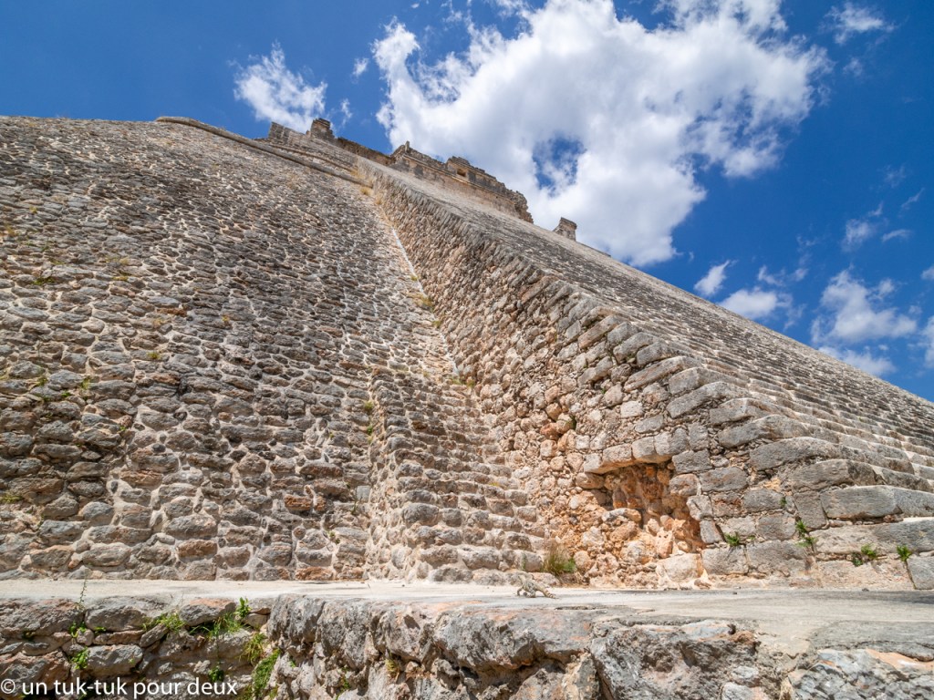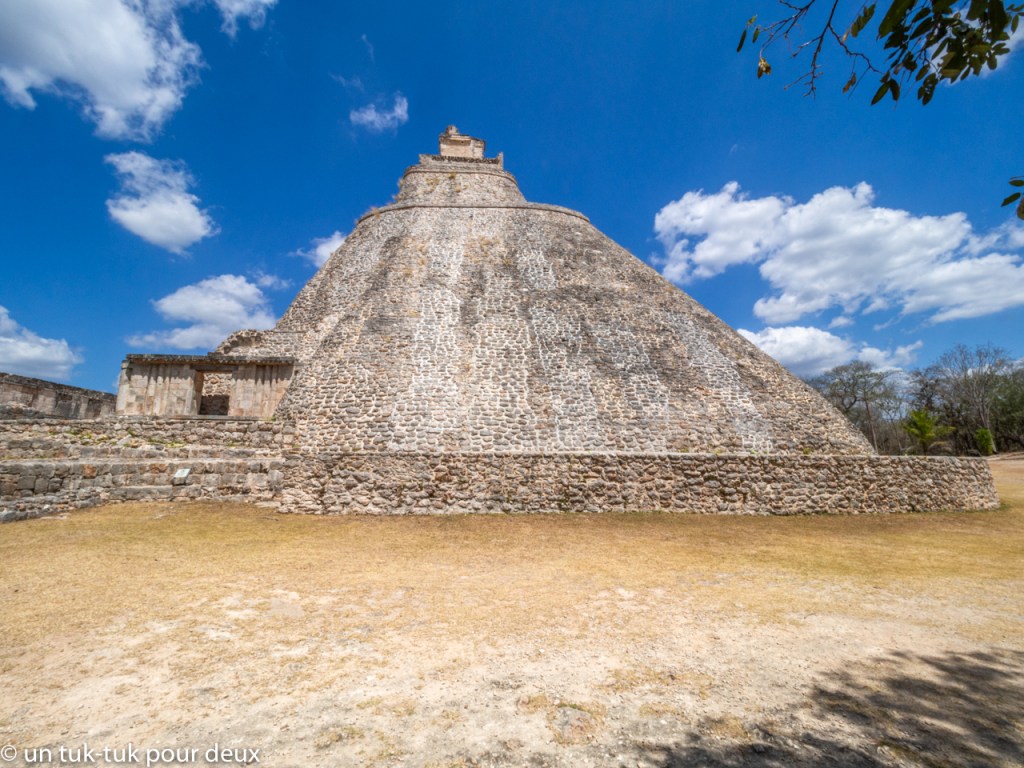 Uxmal compte évidemment plusieurs bâtiments, mais ceux qui dominent sont : 1. La pyramide du Devin ou du Magicien, une pyramide à la forme particulière arrondie qui en impose justement par son unicité. Splendide! On l’admire sous tous ses angles.