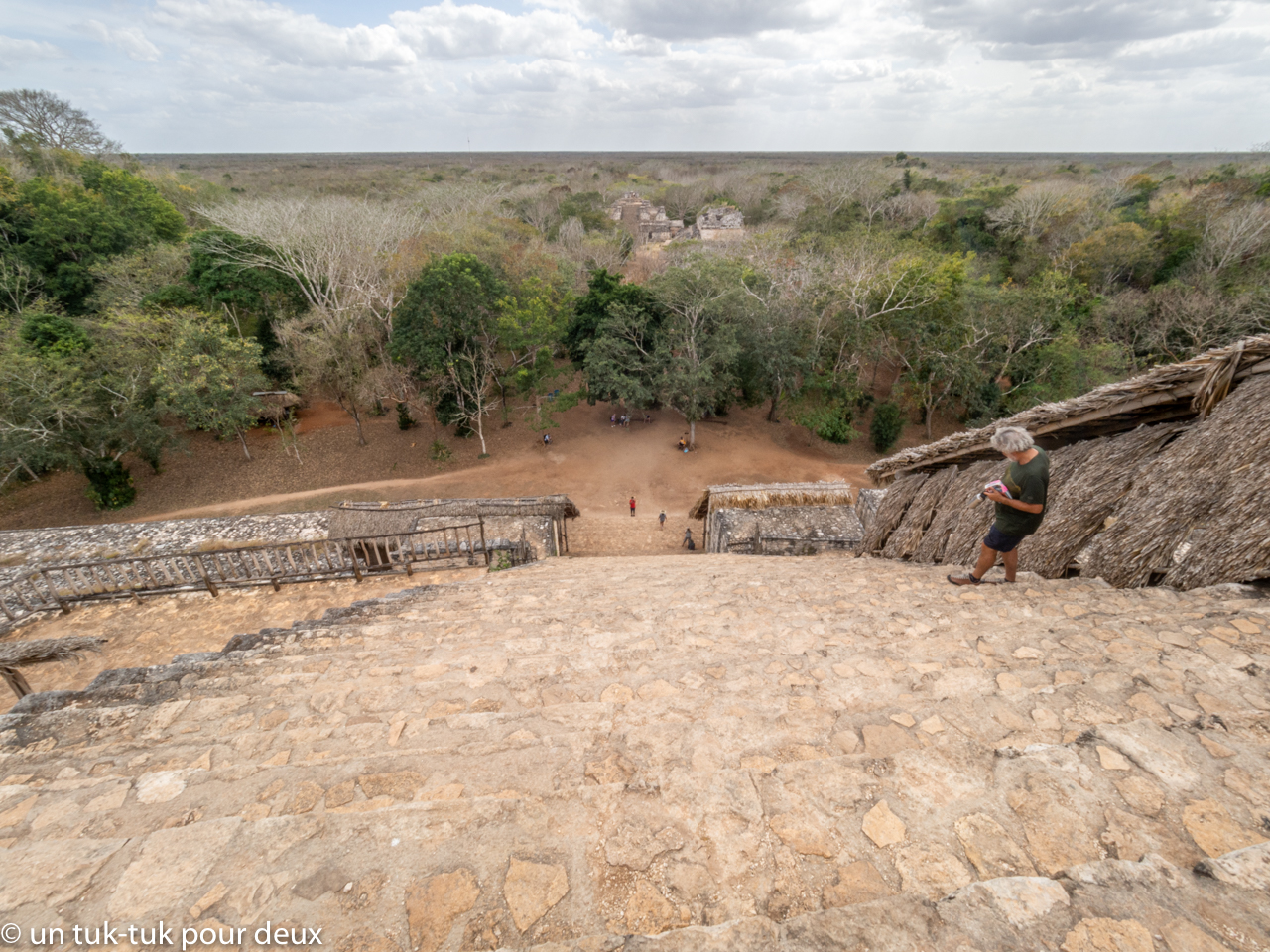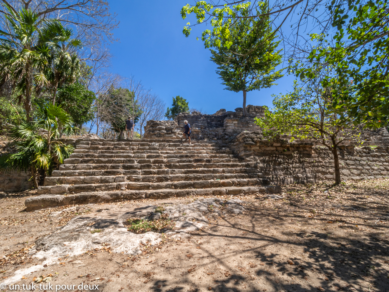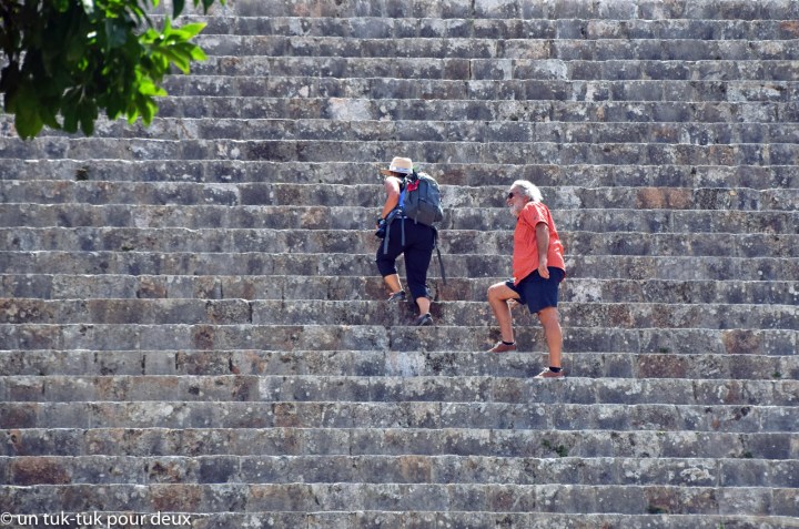 Et finalement, la Grande Pyramide. Bien contents, car nous pouvons grimper à son sommet (encore plus haut que celui d’Uxmal) d’où nous ne pouvons que constater l’ampleur et la beauté de cette ville importante de l’époque préhispanique. Splendide!