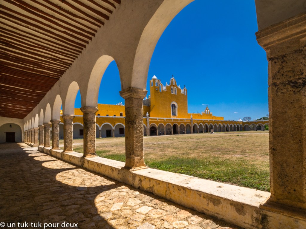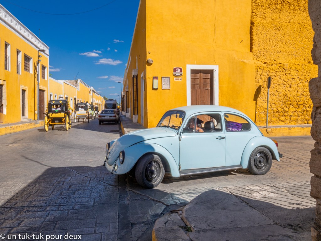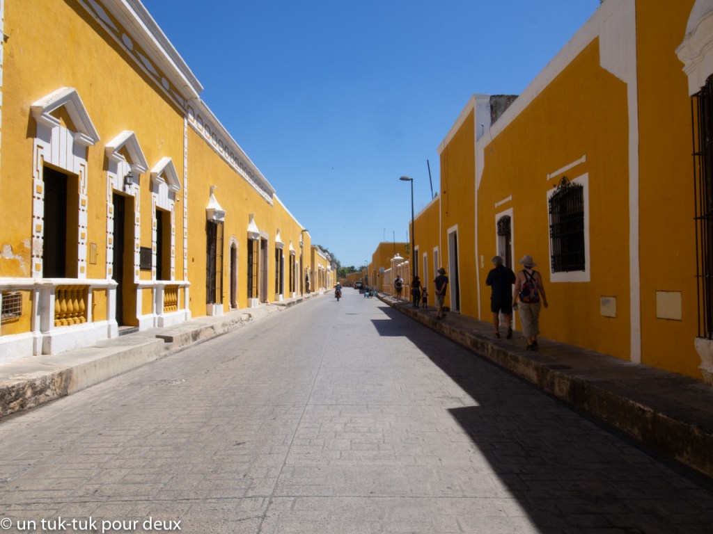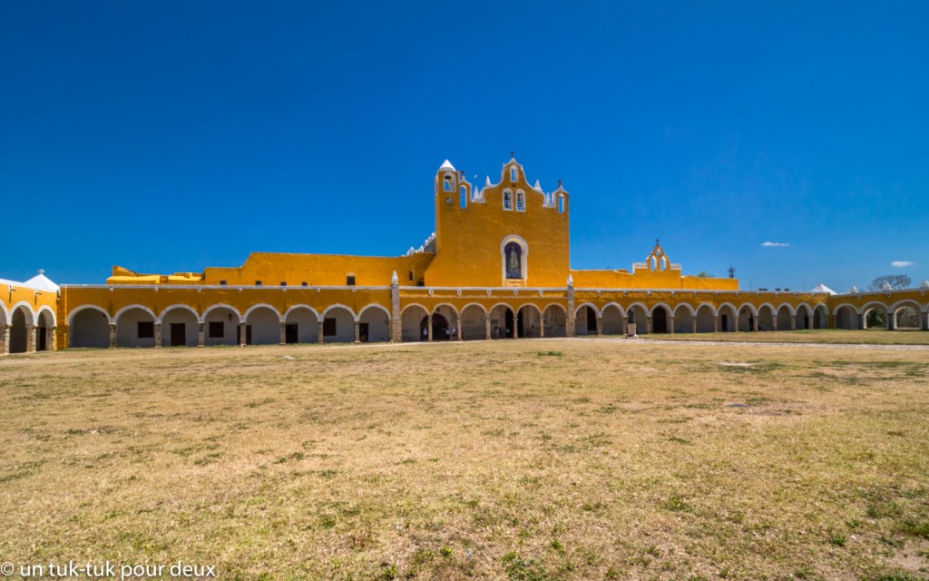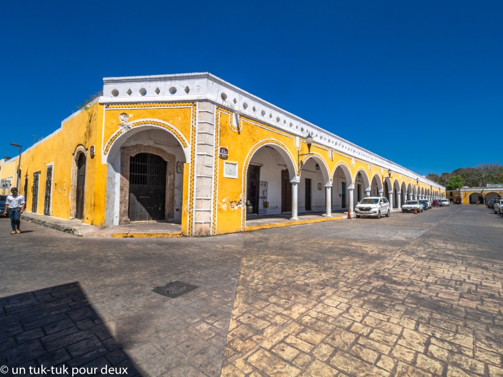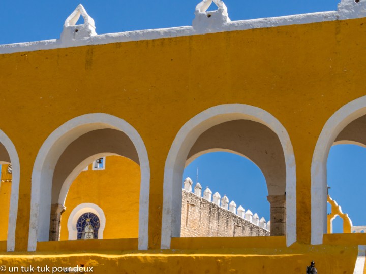 Alors, pour changer des sites Maya, quoique…, nous nous dirigeons le lendemain vers la petite ville de Izamal (26 000 habitants), surnommée la ville jaune, évidemment à cause de la couleur jaune-ocre de la plupart de ses bâtiments. Jumelée avec la teinte froide du ciel, c’est un tableau réussi.