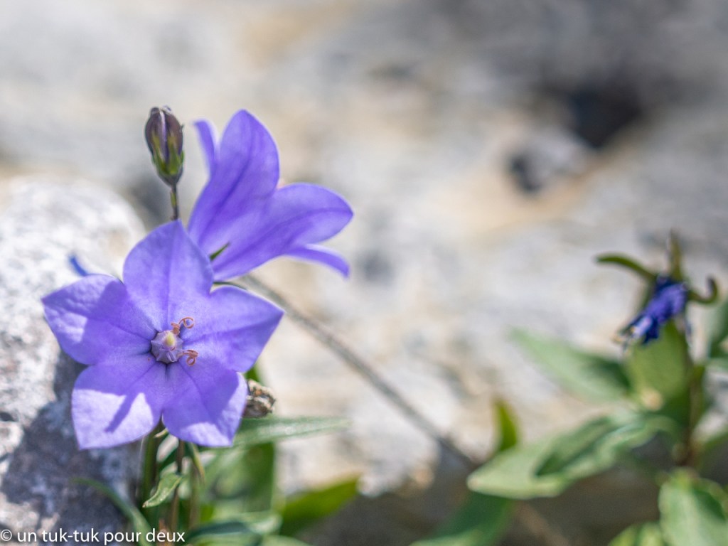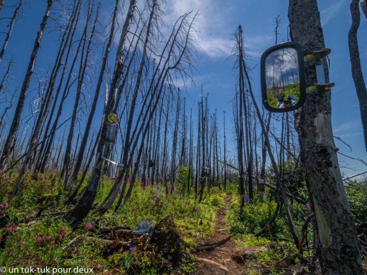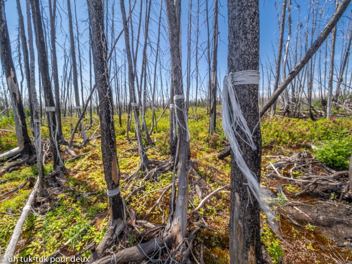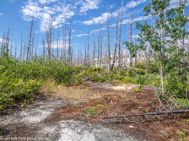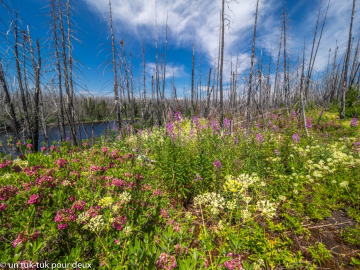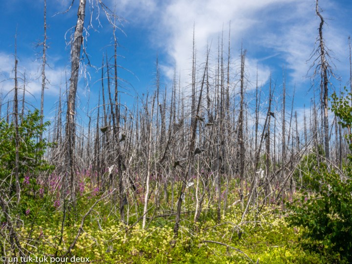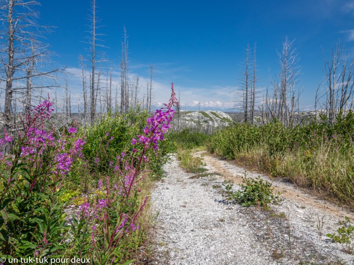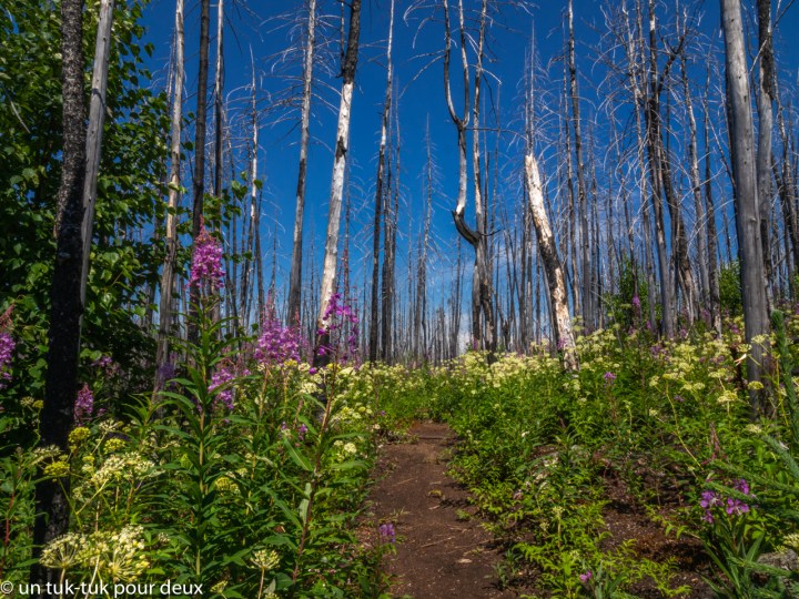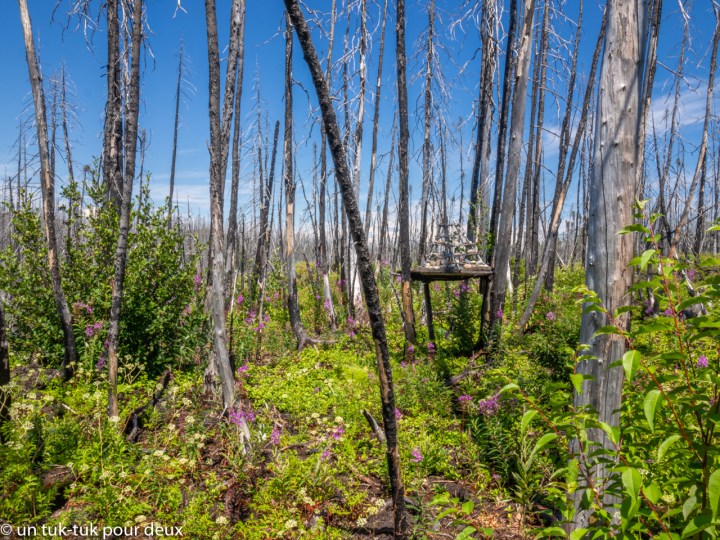 Nous enchaînons notre marche avec le tout petit, mais tellement beau sentier Quétachou de 2 km aller-retour. Victime de l’incendie de 2013 (600 km2 furent incendiés) le sentier a été l’hôte d’une résidence d’artistes qui avaient pour mission de créer des œuvres qui se dégraderaient au fur et à mesure que la nature se régénérerait. Quelle brillante idée et c’est aussi agréable qu’amusant de voir les réalisations au travers des arbres brûlés et des milliers de fleurs sauvages qui recouvrent le sol. Car il faut dire que la période de floraison des rhododendrons alpins, des épilogues et autres espèces toutes aussi jolies les unes que les autres bat son plein. Une belle chute limite le sentier et accueille les marcheurs. Vraiment un endroit qui mérite qu’on s’y arrête sans hésitation.