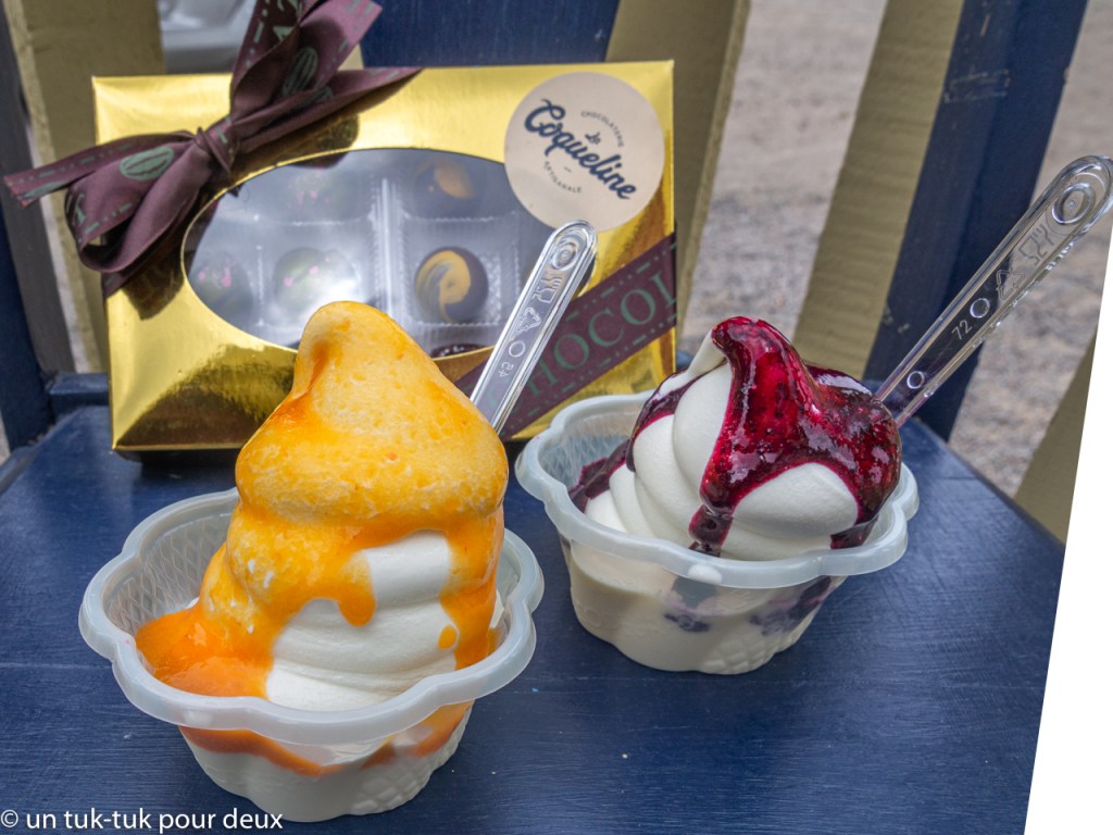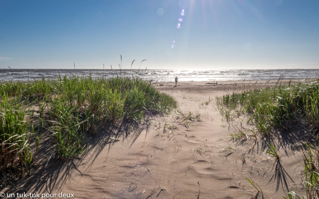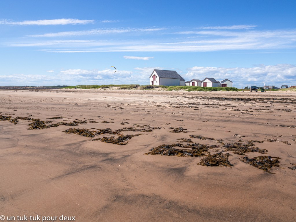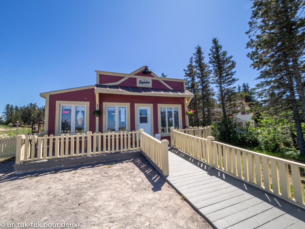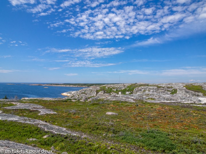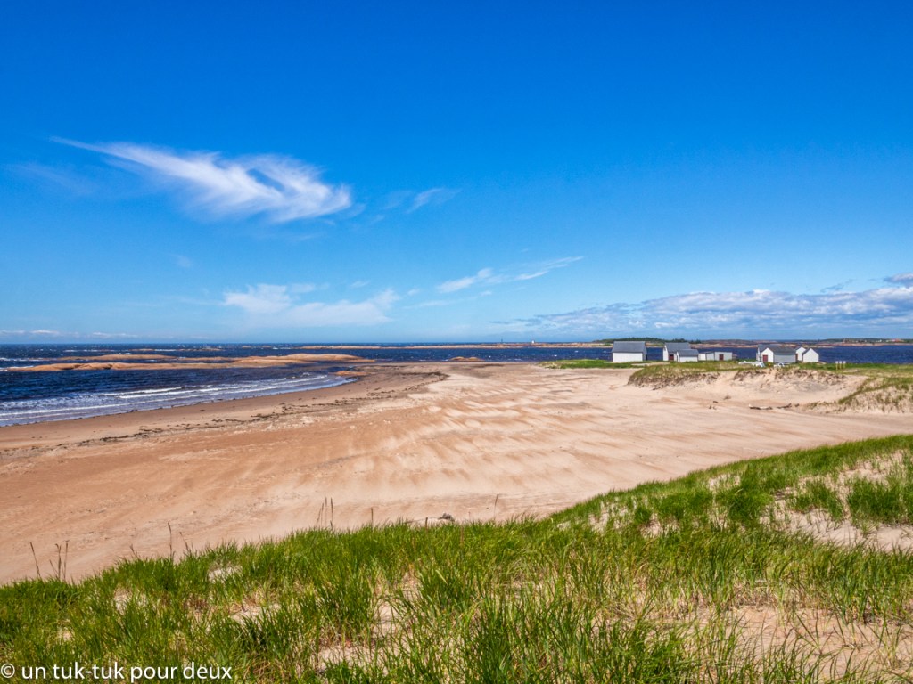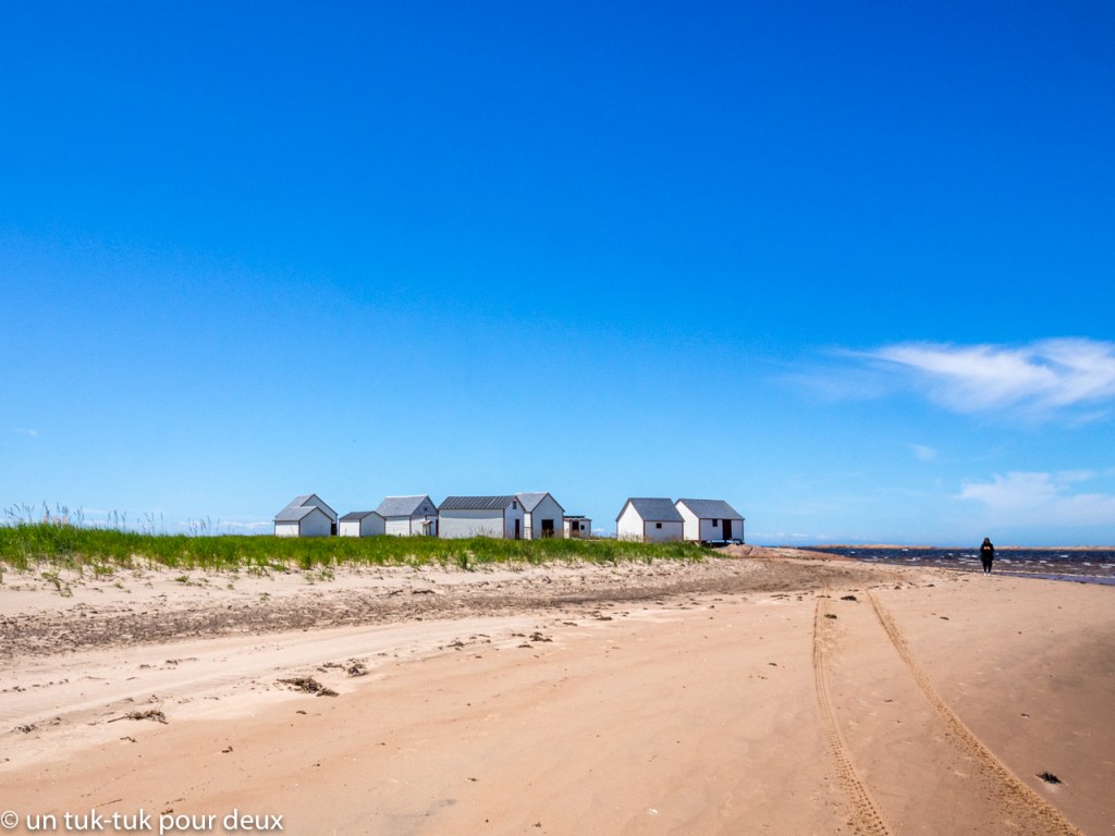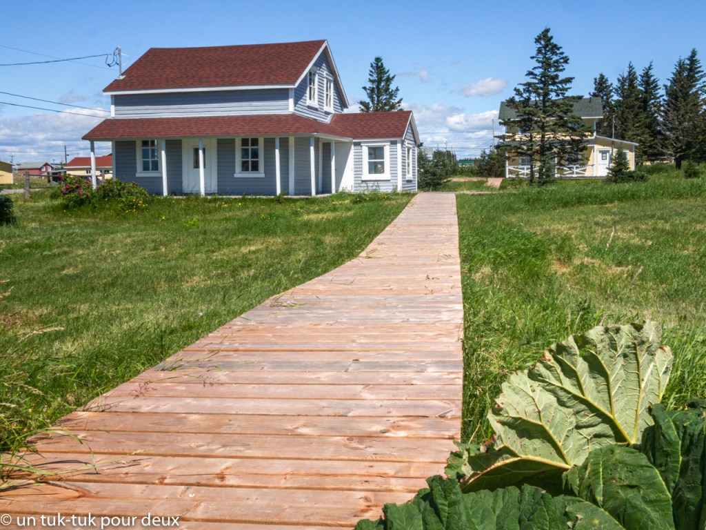 Notre dernière destination vers l’ouest est Natashquan, le pays de notre grand poète québécois Gilles Vignault. En effet, au début, nous envisagions de nous rendre au bout de la route 138, à Kegaska, juste pour dire qu’on a été au bout du monde, mais, à bien y penser, ça ne nous tentait pas vraiment de nous taper la trentaine de kilomètres restante sur une route en gravier. Mais, Natashquan est quand même presqu’au bout du monde avec ses kilomètres de plage de sable fin, un joli camping (avec de la place) dans les dunes, la maison familiale de Vignault et la vieille école (fermées comme bien des endroits à cause de la COVID), les hangars des pêcheurs appelés Les Galets, classés biens culturels du Québec, remémorent depuis 150 ans la vie des pêcheurs de l’époque (aussi fermés) et ils sont très photogéniques. Qu’est-ce que c’est beau! Mais outre qu’il s’agit d’un très beau village, il y a une superbe chocolaterie artisanale avec des chocolats à la chicoutai et autres petits fruits sauvages que vous n’oublierez jamais! Paroles de un tuk-tuk pour deux! En tout cas, nous on en salive encore!