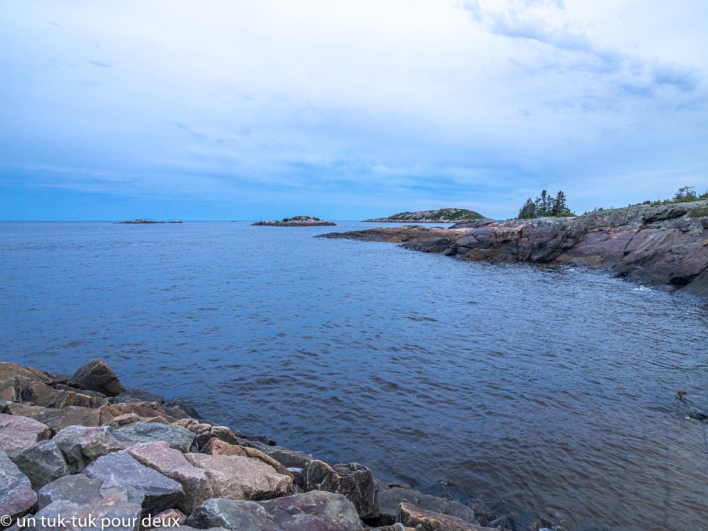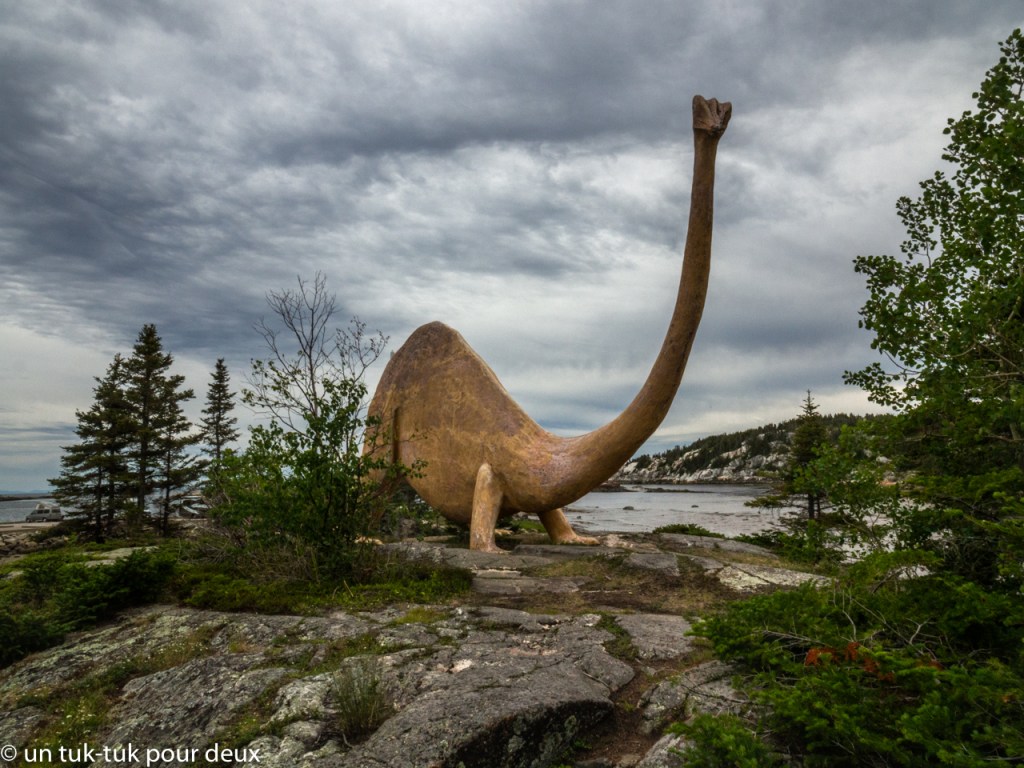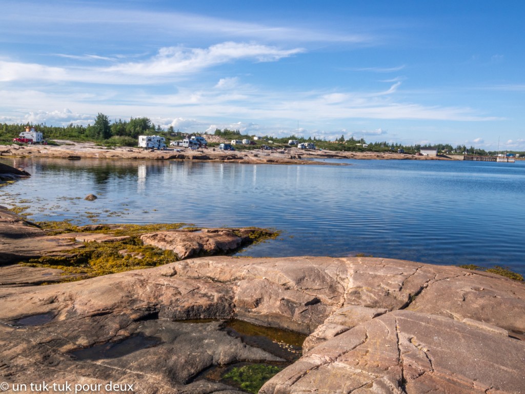 Puis, un peu de route vers la région de Baie-Comeau où nous nous arrêtons au quai de Ragueneau, reconnu comme Friendly RV. Effectivement un beau spot où deux dinosaures nous accueillent pour la nuit. Juste à côté du quai, un tout petit sentier offre de jolis points de vues. Nous contribuons allègrement à la boite de donation volontaire « pour l’église ».