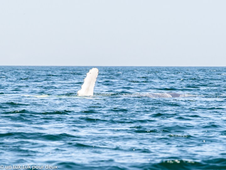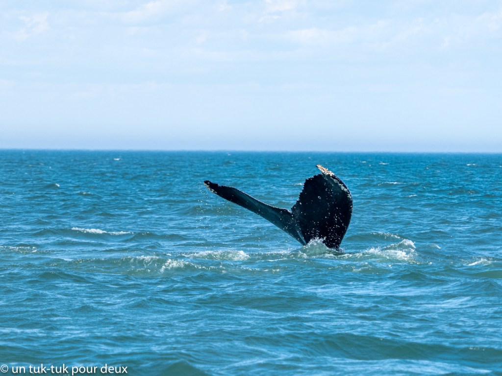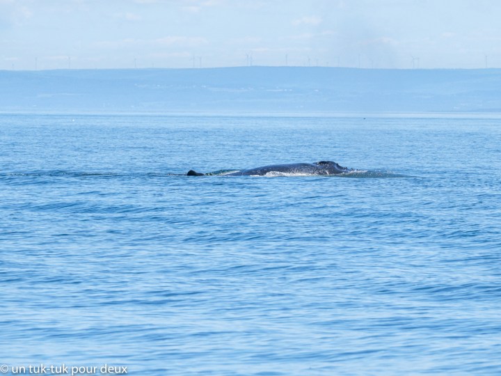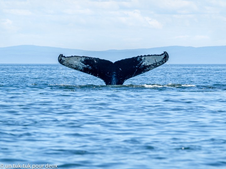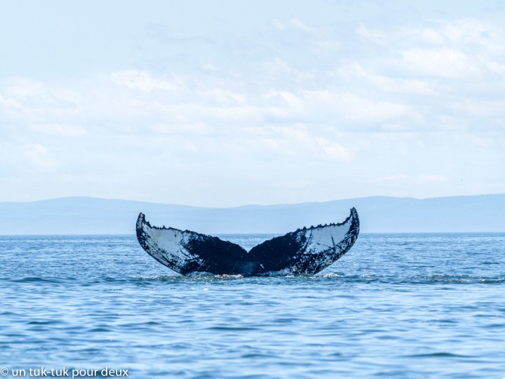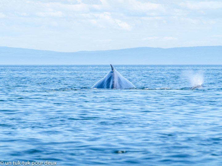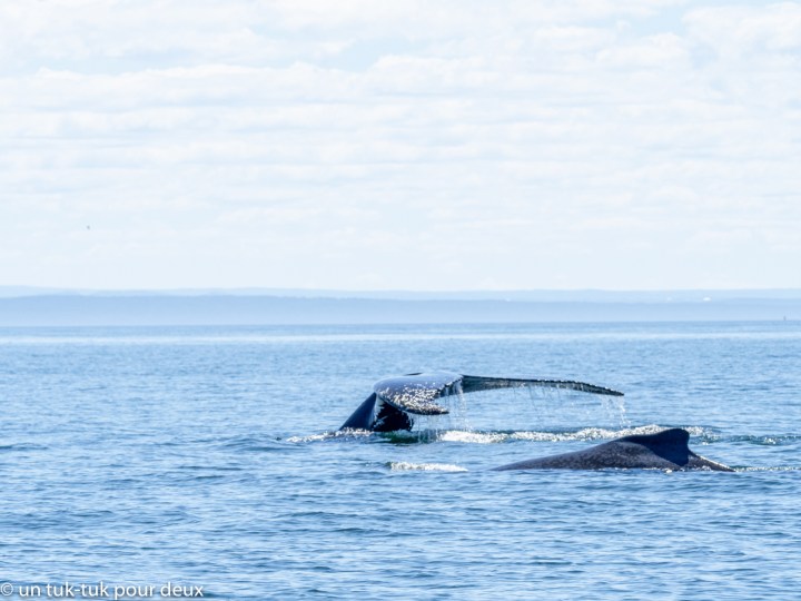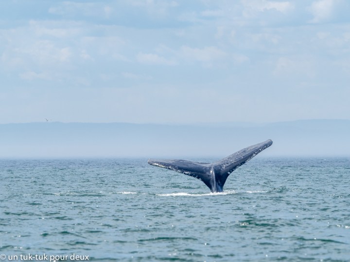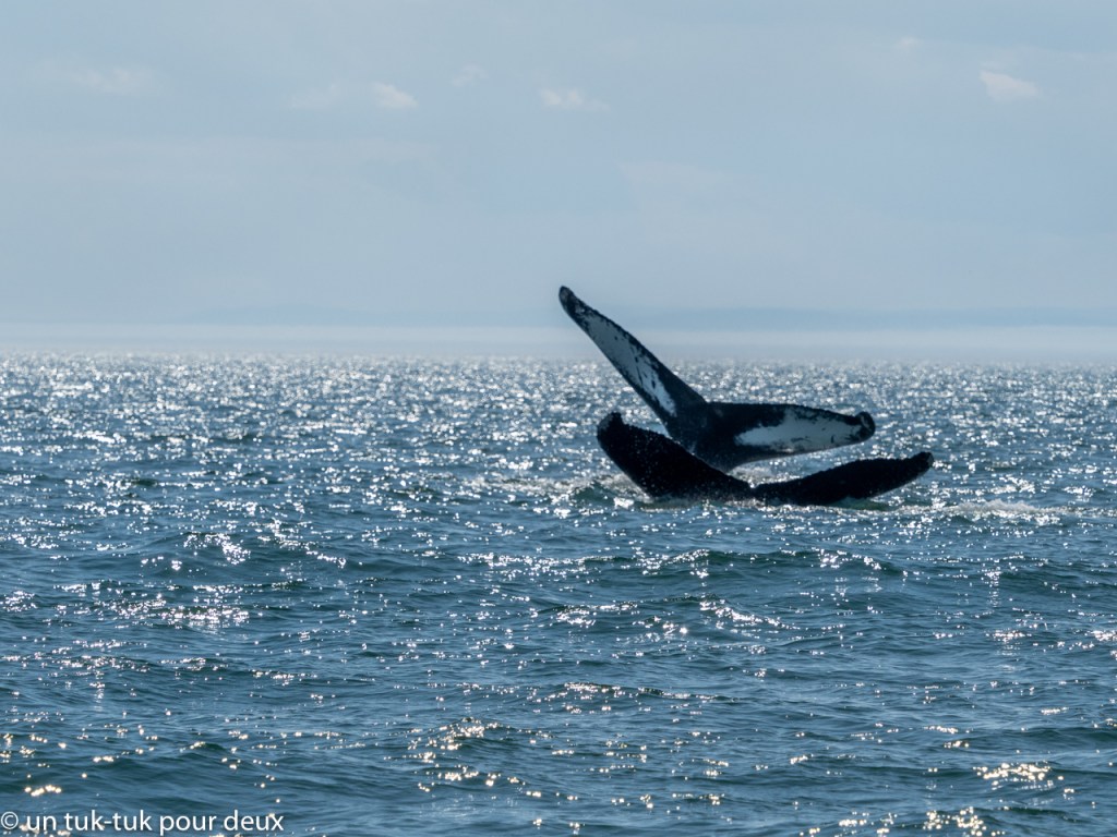 Vous nous voyez venir n’est-ce pas! Hé oui! Une croisière privée de plusieurs heures au beau milieu du Saint-Laurent pour un safari marin. Allez les baleines, on arrive! Il fait un temps merveilleux sous un ciel bleu, il fait chaud et le fleuve, tel un miroir, nous offre la chance d’observer dans un calme rare moult rorquals, phoques gris, dauphins à flanc blanc, fous de Bassan, petits pingouins, etc., mais également et bien sûr, les majestueuses baleines à bosse et petits rorquals en grand nombre. Notre capitaine, très attentionné a probablement un don pour repérer les grands mammifères pour le plus grand bonheur des photographes à bord. Il s’assure qu’elles sont satisfaites avant de changer de cap. Nous aurons même droit à des spectacles de nage sur le dos, sur le côté avec les nageoires latérales dans les airs et présentation de la queue à plusieurs reprises de Tic Tac Toe avec son présumé bébé ou encore de Blanche-Neige. Ce fut une journée mémorable! Merci encore à Léopold!