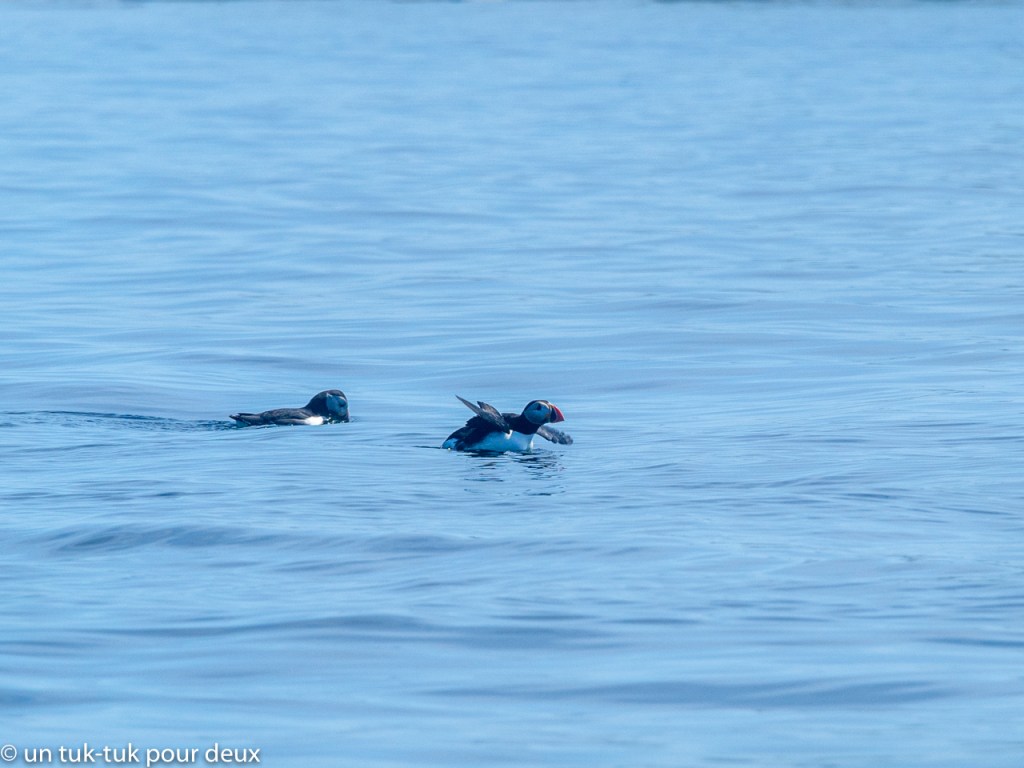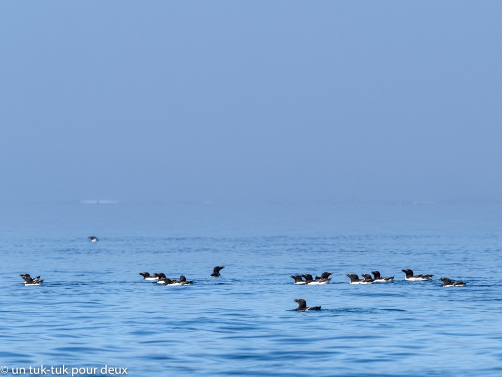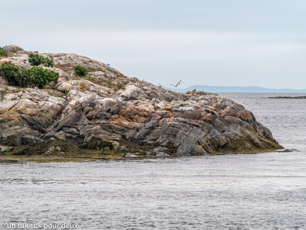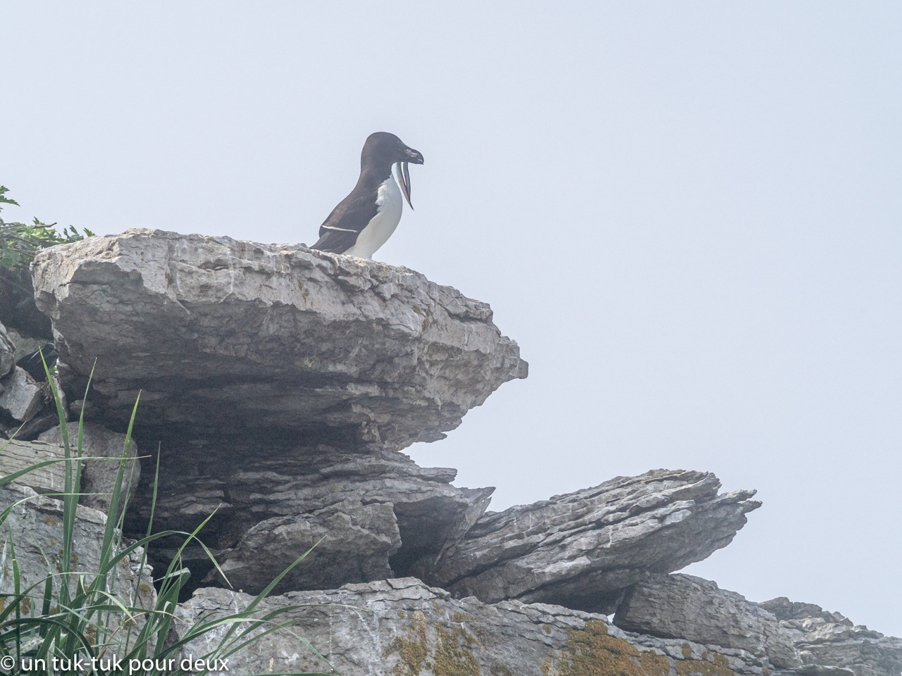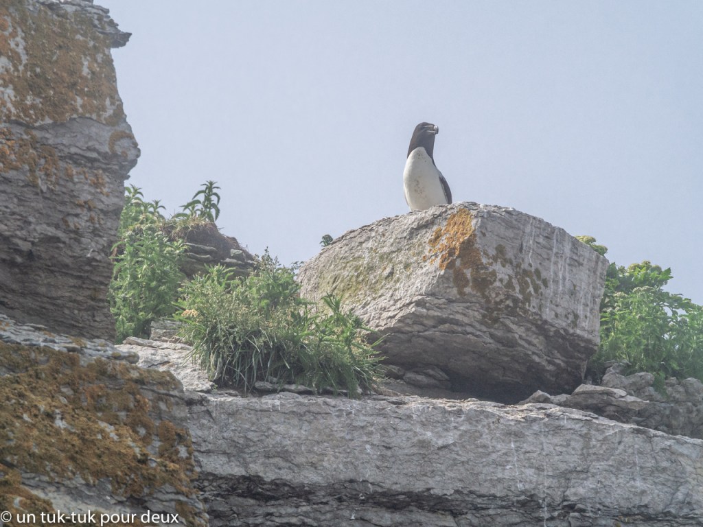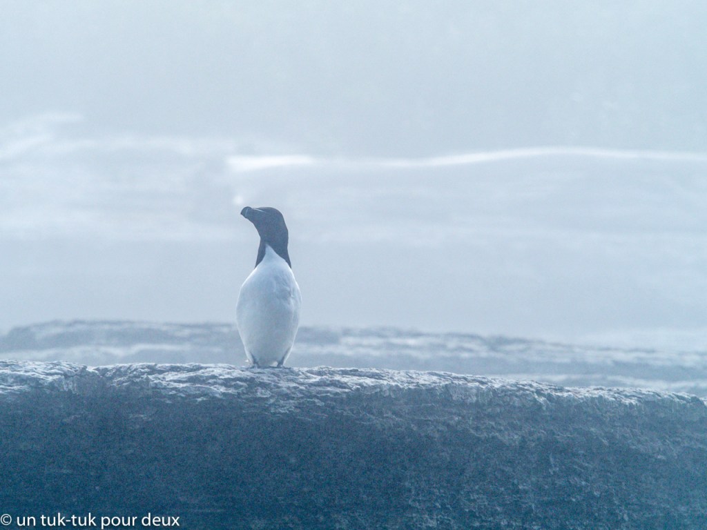 Nous, on veut voir les mignons petits pingouin! Ils nichent de chaque côté de l’île et l’accès est très limité pour leur protection. Du premier côté, nous apercevons nos premiers petits pingouins. Malheureusement, le coup de vent souhaité n’est pas passé et la brume encore assez épaisse, ajoutée à la distance qui nous séparent, rend bien difficile la séance photo. Quelques clichés, mais bon, nous décidons d’aller sur l’autre versant où nous aurons plus de chance.