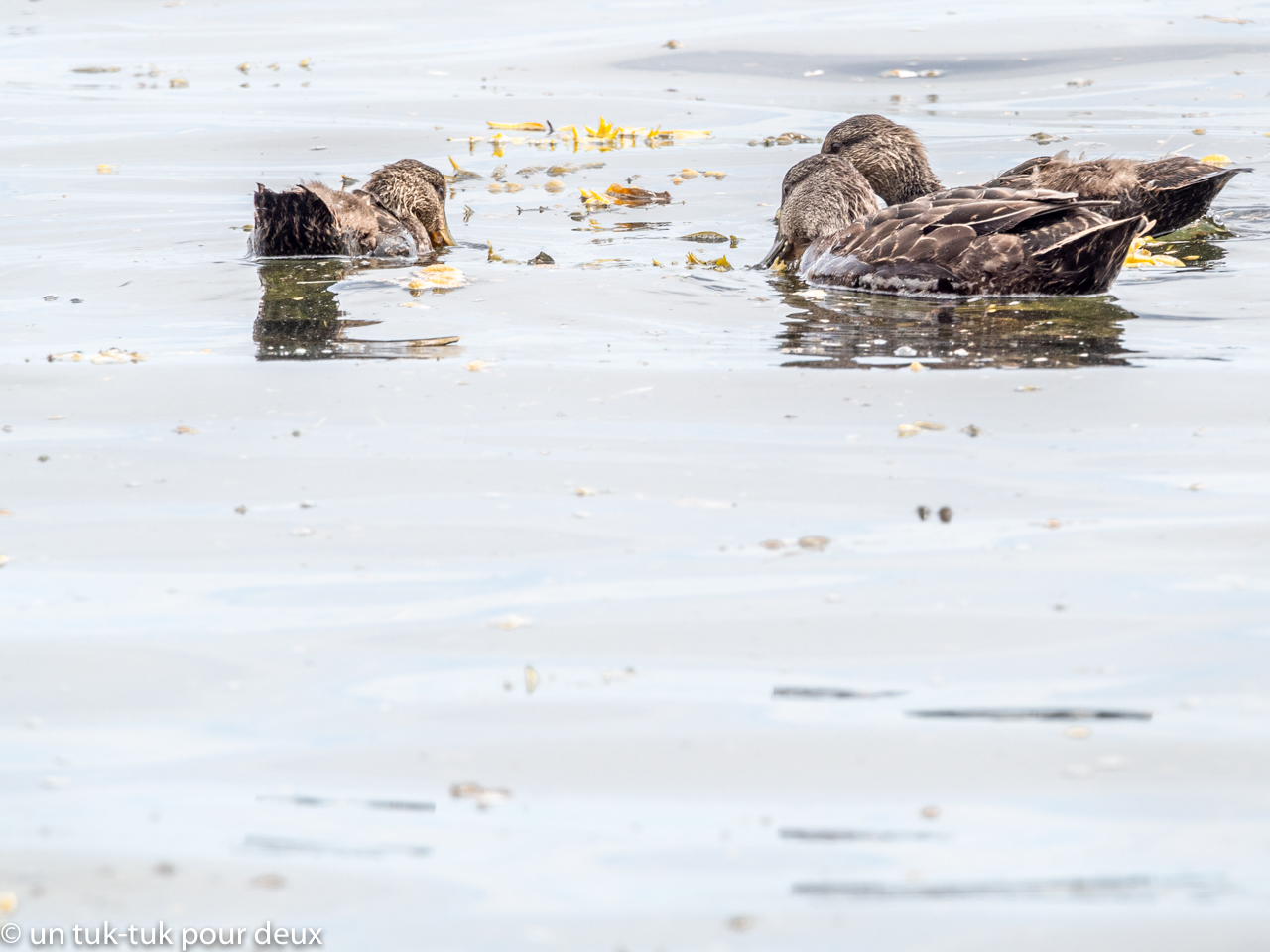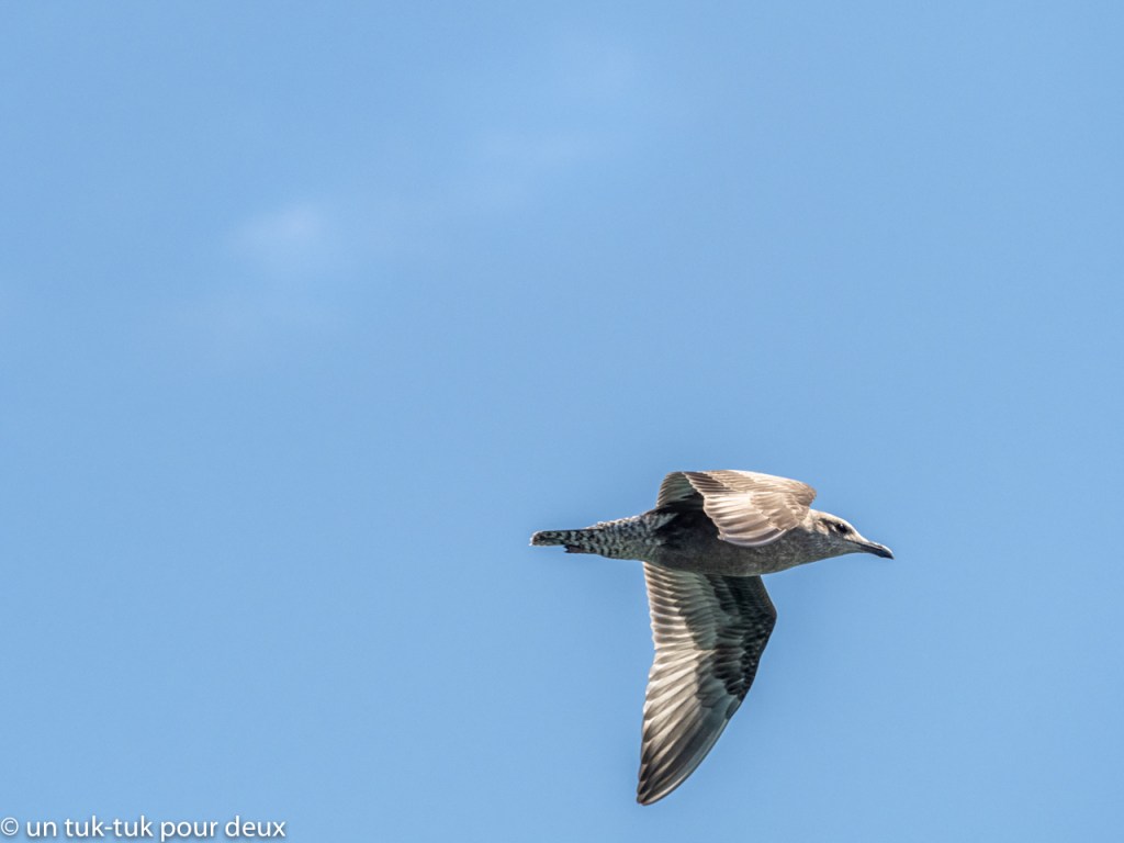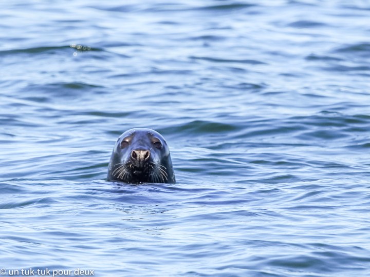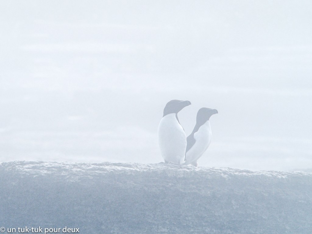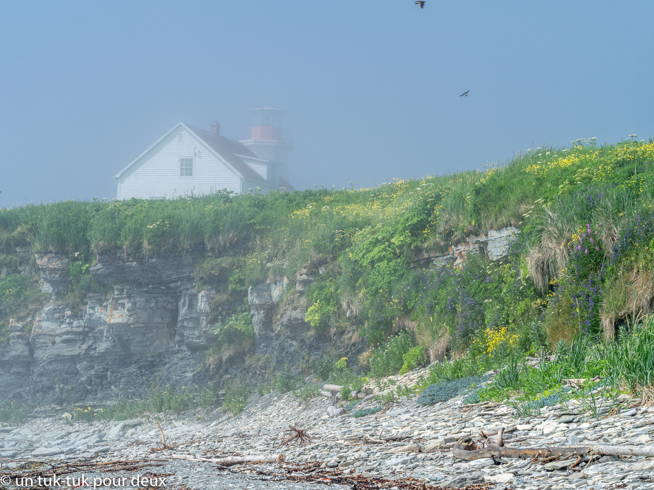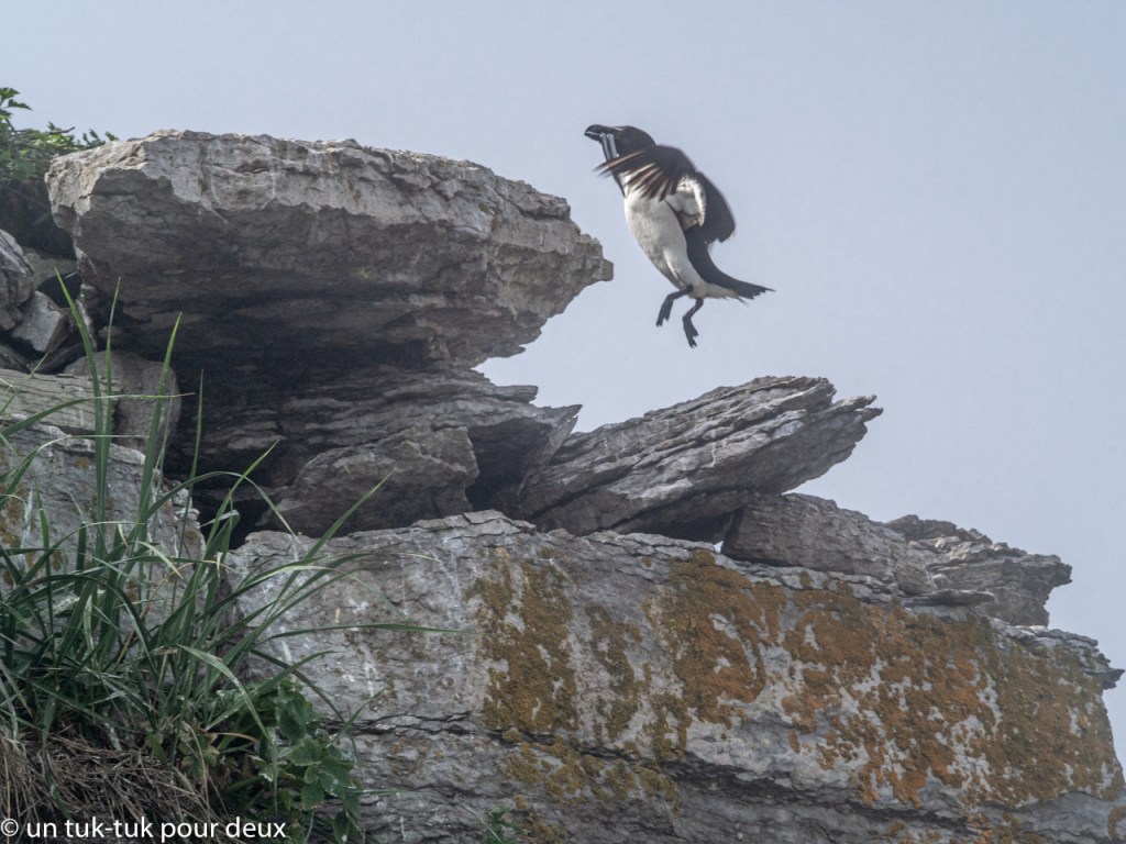 Nous, on veut voir les mignons petits pingouin! Ils nichent de chaque côté de l’île et l’accès est très limité pour leur protection. Du premier côté, nous apercevons nos premiers petits pingouins. Malheureusement, le coup de vent souhaité n’est pas passé et la brume encore assez épaisse, ajoutée à la distance qui nous séparent, rend bien difficile la séance photo. Quelques clichés, mais bon, nous décidons d’aller sur l’autre versant où nous aurons plus de chance.