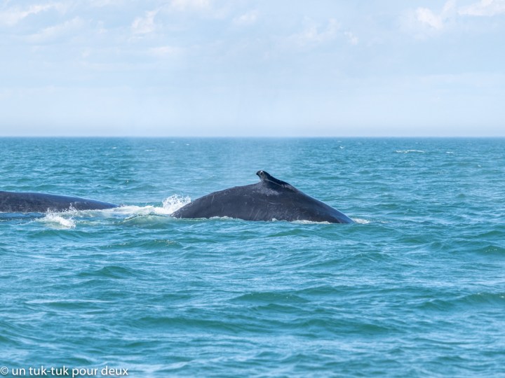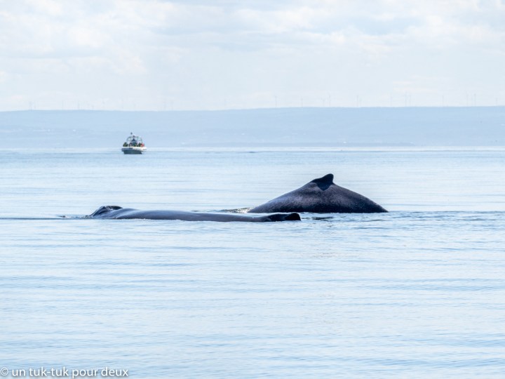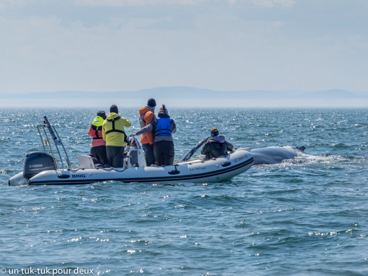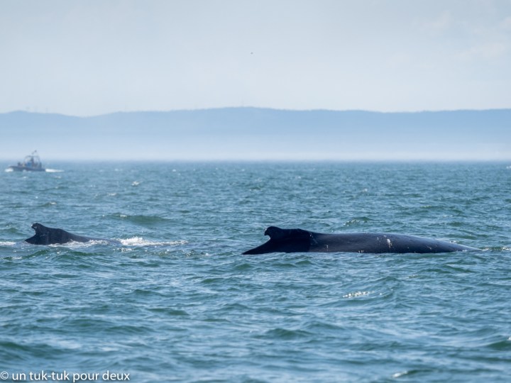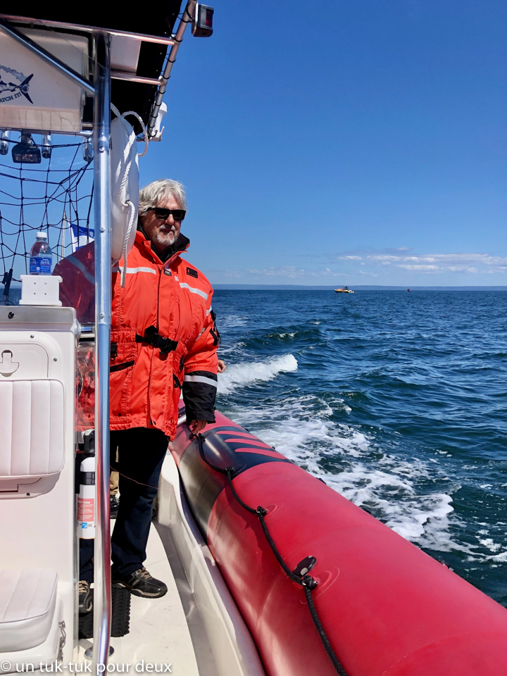 Nous avons tellement adoré, que nous répétons l’expérience à notre retour dans Charlevoix. Une autre journée incroyable. Les baleines étaient présentes en grand nombre et encore plus actives que le tour précédent. Nous avons revu Tic Tac Toe et son rejeton, Blanche-Neige ainsi que de nouvelles baleines, notamment Gaspar et d’autres qu’on ne peut identifier. Cette fois-ci, pas de problème de batteries ou d’appareil photo. Dominique étrenne son boîtier encore tout neuf et elle s’en est donné à cœur joie.