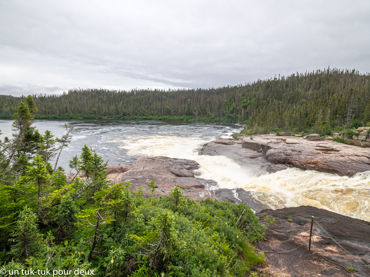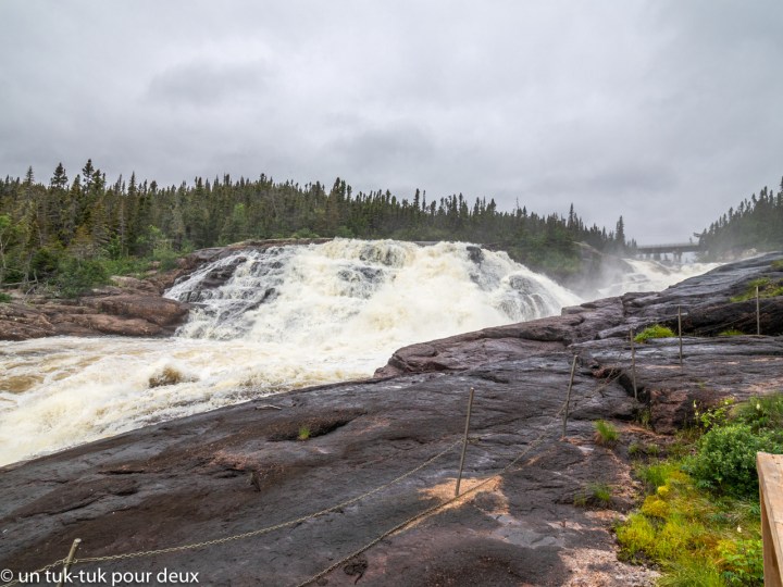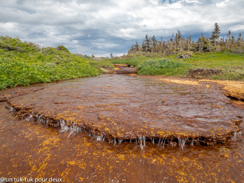 Prochain arrêt, Havre-Saint-Pierre. Le camping affiche complet et on nous offre de nous installer dans le parking d’entrée, mais cela ne nous dit rien. C’est loin de la mer et du centre. Très peu d’intérêt pour nous. Au centre d’information touristique, on nous dirige vers le stationnement en gravier juste en face de l’église en plein centre de la ville. Relativement tranquille, ça fera très bien l’affaire pour une nuit d’autant plus que l’on peut aller partout à pied. Nous nous informons sur les possibilités de visiter la centrale Romaine-1, pas de place! Nous y passerons quand même pour au moins la voir de l’extérieur. Bof! Ça ne valait pas réellement le détour. Par ailleurs, nous réservons une croisière pour explorer le lendemain, la partie est de l’archipel-de-Mingan, là où les monolithes sont en plus grand nombre. Il faut savoir que cette partie du parc ne peut se visiter qu’à partir de Havre-Saint-Pierre et qu’il n’y a qu’une seule compagnie qui offre ce tour. Pour le reste de la journée, nous nous rendons au Cap Ferré pour un pique-nique. À quelques 20 minutes de route à l’est de Havre-Saint-Pierre (au km 1232), une route de gravier direction sud pendant environ 5 km (en gardant toujours la droite) conduit jusqu’à un stationnement. De là, une courte marche d’environ un kilomètre nous mène à la chute du Cap Ferré, très connue des gens du coin. Il s’agit d’un petite rivière qui, en arrivant sur le cap de pierre rouge, chute directement dans le fleuve d’une hauteur d’une dizaine de mètres. Ce n’est pas les chutes Niagara et même s’il ne s’agit que d’une très courte distance, prévoyez y passer quelques heures. Le sentier a la même formation géologique que celle de l’archipel de Mingan, sa flore rare ainsi que la cascade en tant que telle sont dignes de figurer parmi les plus beaux clichés Instagram et, surtout, vous voudrez y lézarder un brin.