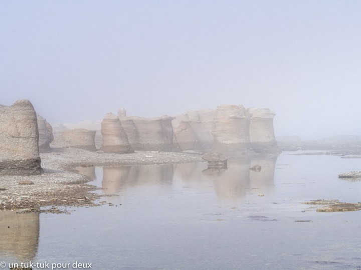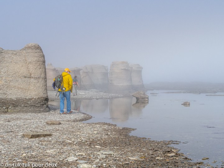 Nous visitons d’abord l’île Nue, qui doit son nom au fait que la forêt y est absente. Ce sont ses beaux monolithes qui constituent le principal attrait de l’île. Encore une fois avec la brume, cela ajoute un côté mystique à l’endroit. On adore et la photographe fait de son mieux pour faire ressentir cette sensation sur ses images. Nous croisons nos doigts tout de même pour qu’un bon coup de vent passe afin de dégager le ciel pour notre prochain arrêt à l’île aux Perroquets, là où curieusement aucun perroquet ne vit…