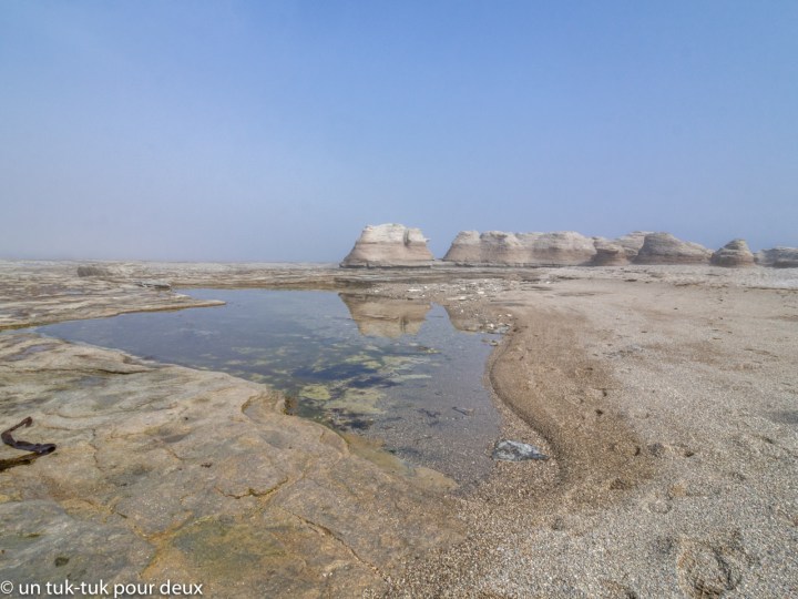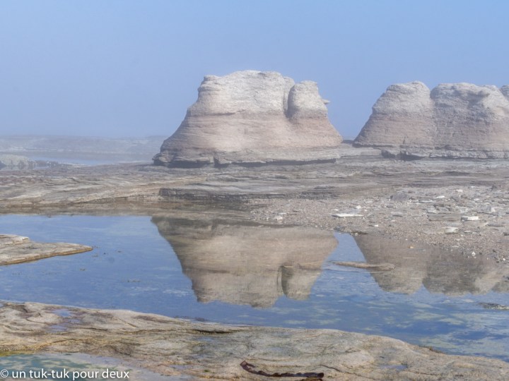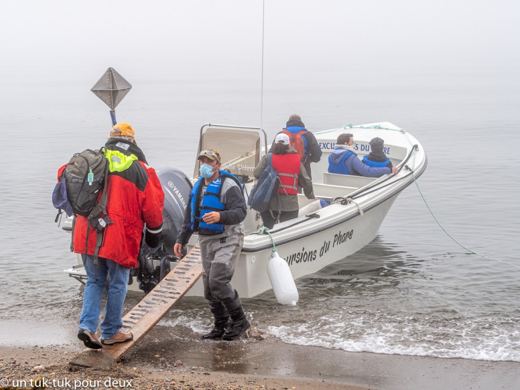 Quant au bateau de croisière, il s’agit presque d’une grosse chaloupe (12 passagers) et l’embarquement se fait directement sur la plage. Nous avons droit à un temps brumeux, mais la mer est d’un calme rare, aucune onde, c’est très étrange comme atmosphère, mais c’est extraordinaire.