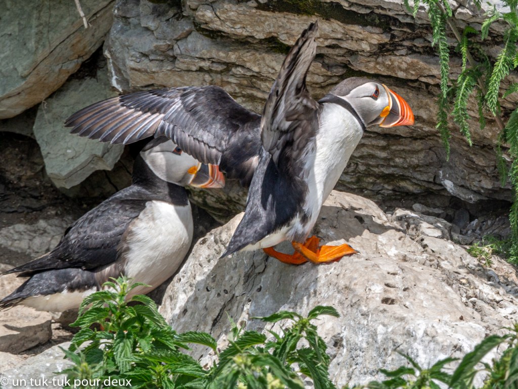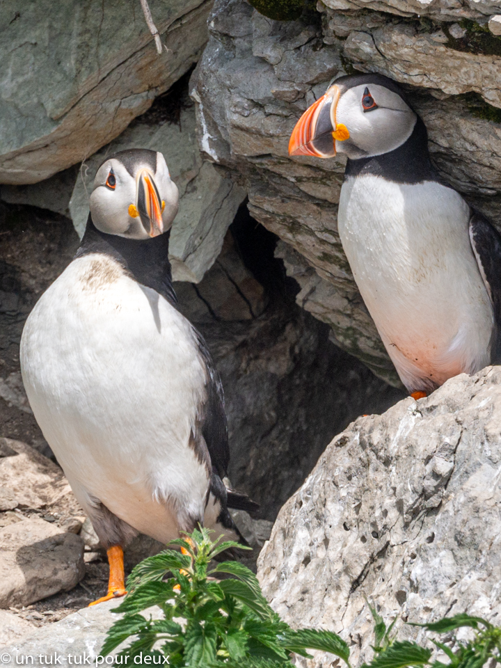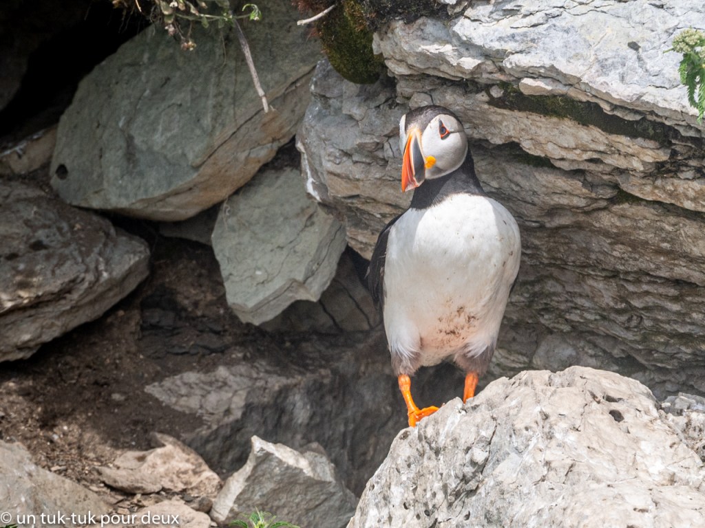 De ce côté, il y a un dégagement à l’endroit où nichent les oiseaux et où l’on aperçoit notre premier macareux moine. Eurêka! On s’installe par terre et la photographe prend son plaisir en mitraillant les petits volatiles. D’ailleurs, si l’île porte le nom de perroquets, c’est justement à cause de cet oiseau surnommé « petit perroquet ». Devinez pourquoi. Bien sûr, en raison de son bec coloré qui s’apparente à celui d’un perroquet.